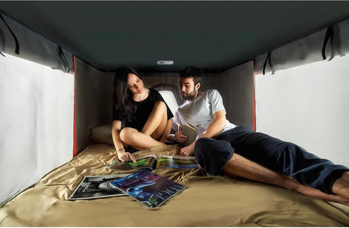 Das Öffnen und Schließen geschieht augenblicklich, dank der praktischen Kurbel. Das Dachzelt wird mit der Kurbel in wenigen Augenblicken geöffnet. Die Zuverlässigkeit dieses Mechanismus ist legendär. Die Kurbel dreht 2 durch eine Kette verbundene Gewindespindeln mit 4 Muttern. Diese Muttern drücken die Hubstreben und damit das Dach nach oben. So kann selbst bei Sturm die notwendige Stoffspannung erzeugt Werden. Außerdem wird sehr geschätzt, weil man damit den Stoff perfekt straff spannen kann. Auch nach Jahren lässt das Gewebe nicht nach und somit zugute der Stabilität und Ästhetik des Zeltes. Die Kurbel ist gleichzeitig ein Diebstahlschutz für das Innengepack (z.B. Taschen, Decken, Wertgegenstände, etc.), da sich ohne Kurbel die Schalen nur sehr zeitaufwändig öffnen lassen). Der Dachboden ist schalldicht und gut gedämmt, um Kondensat zu vermeiden. Das Dachzelt enthält eine Qualitäts-Deckenlampe (18x5cm) mit 3 leuchtstarken LED, betrieben mit Batterie. Der Innenhimmel ist mit einer wärme- und geräuschdämmenden Polsterung ausgekleidet. Die Ausstattung umfaßt eine Matratze aus High-Density-Schaumstoff mit Baumwollbezug und Kopfkissen. Ein Windschutzstreifen unter dem Eingang schützt vor Staub, Kälte und Luftzug. Außerdem inklusive ist eine verstellbare Aluminium-Leiter für ein Fahrzeug mittlerer Größe. Für den Transport wird sie zusammengeschoben und bei Bedarf auseinandergezogen und verriegelt. Das Antirutschsystem ist serienmäßig.