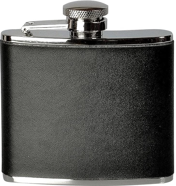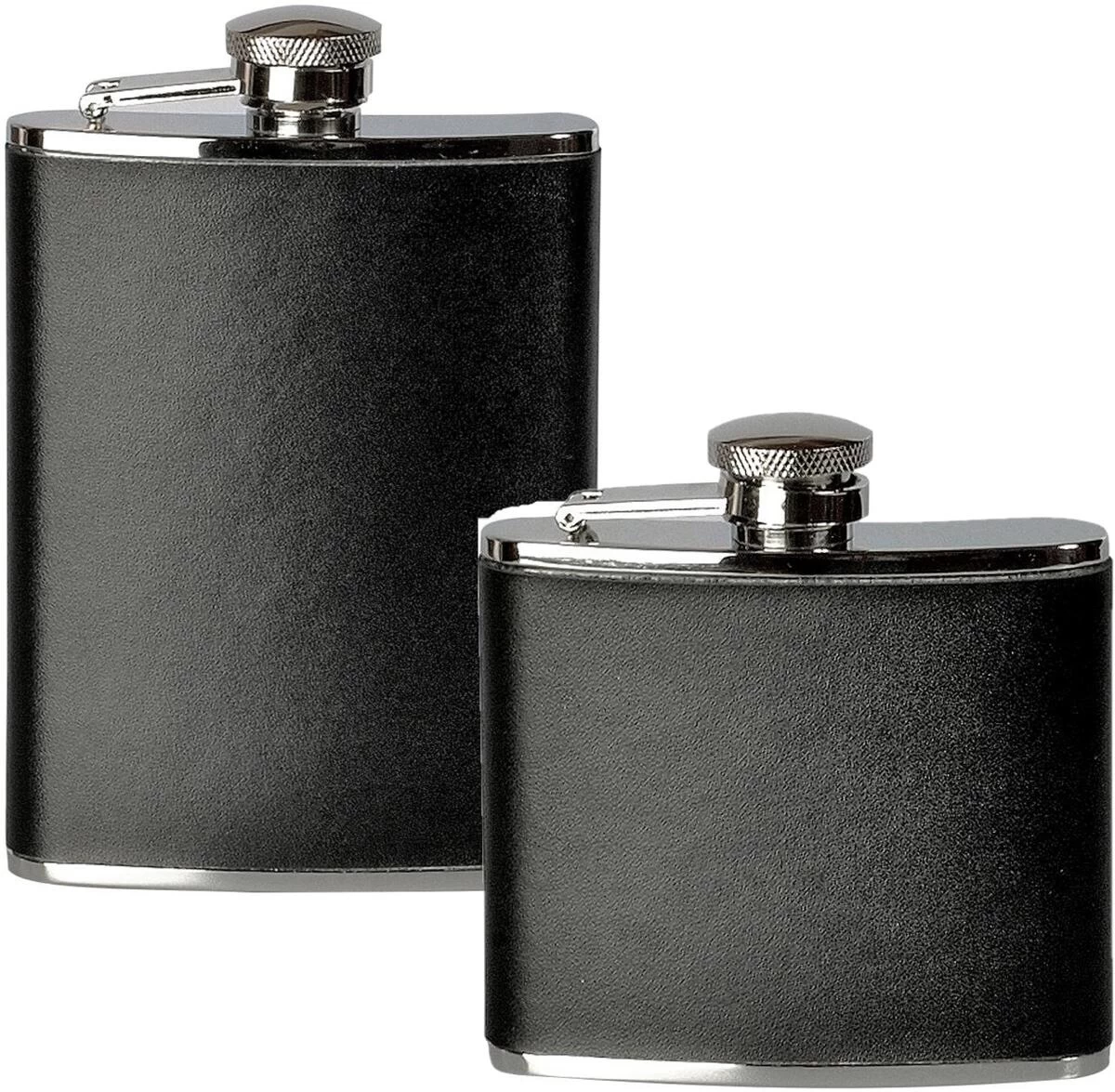 Edelstahlflaschen mit attraktivem und griffigem Lederbezug (Kunstleder). Unverlierbarer Deckel.