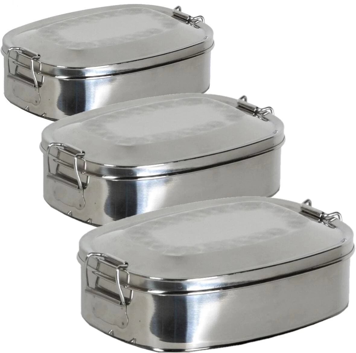 Praktische Proviantdose aus Edelstahl. Der Deckel wird mit 2 Rollklammern auf der Dose gehalten. Perfekt für Brote, Obst oder Proviant. Aber auch für Kleinzeug, Fotozubehör, Erst-Hilfe-Sets, als Spardose oder für das Schuhputzzeug geeignet. Kann zur Not auf Flammenkochern benutzt werden (OHNE Deckel). Ohne Dichtung.