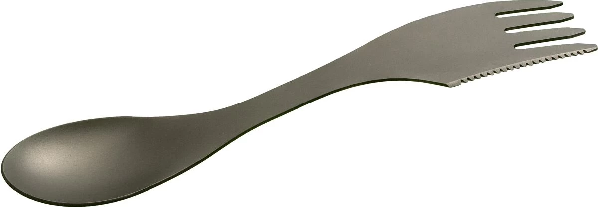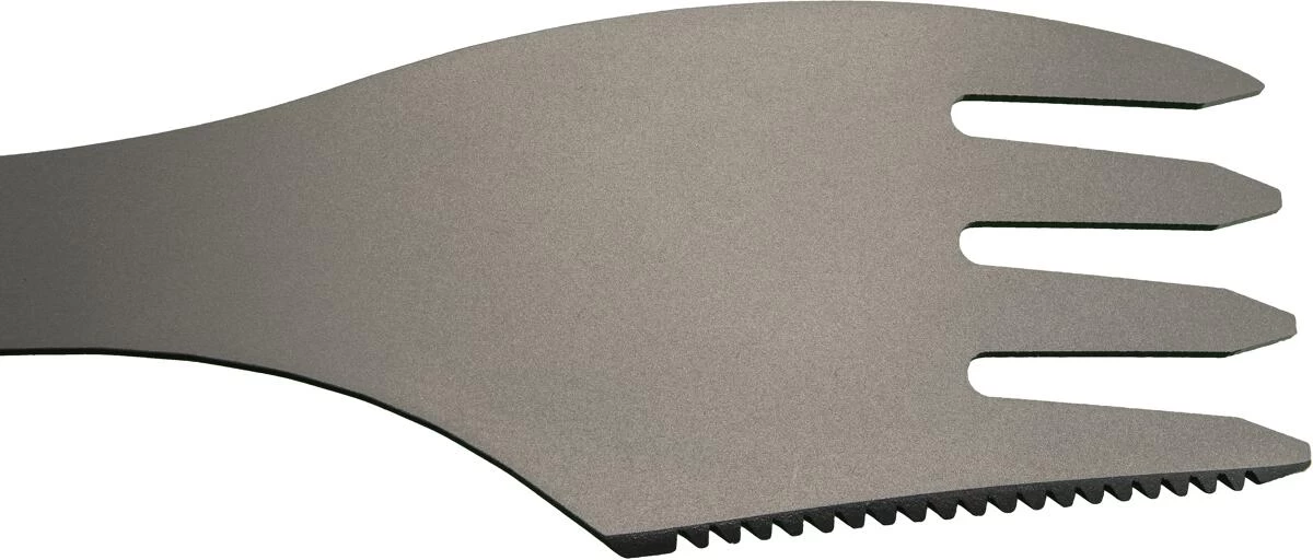 Extra leichtes Universalbesteck mit Gabel, Löffel und gezackter Messerschneide. Die längere Schneidefläche sorgt für ein besseres Schneiden Ihrer Speisen. Hergestellt aus hochwertigen Titan, mit abgerundeten Kanten und ergonomischer Löffelgeometrie. Dank der Multifunktionalität sparen Sie zusätzliches Gewicht. Der rostfreie Spork ist der perfekte Begleiter zum Reisen, Wandern und Trekking.