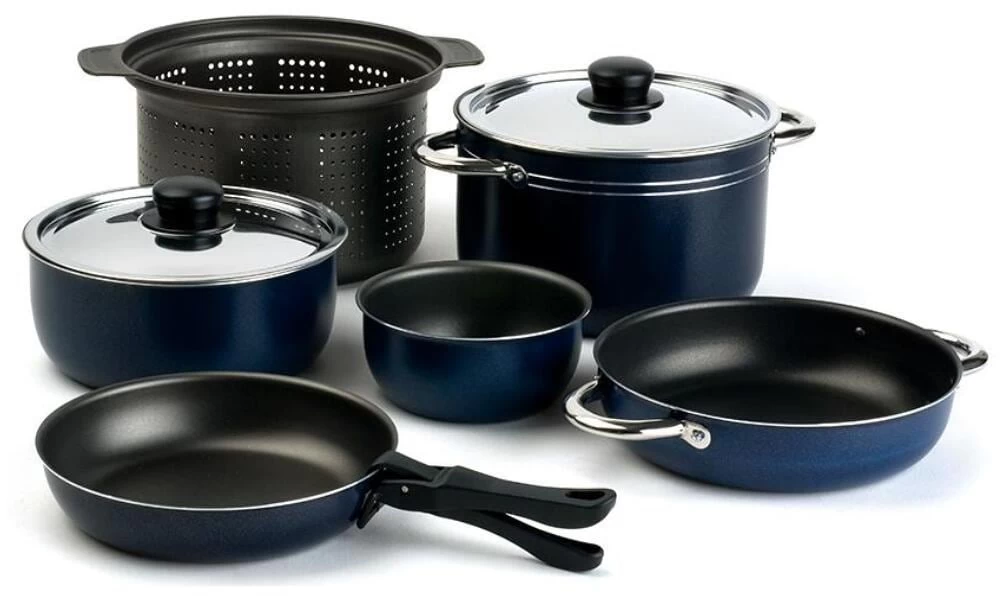 Kochset aus Aluminium mit lebensmittelechter Anti-Haft-Beschichtung und Griffen aus rostfreiem Stahl. Das Set ist ideal für 5 Personen geeignet.