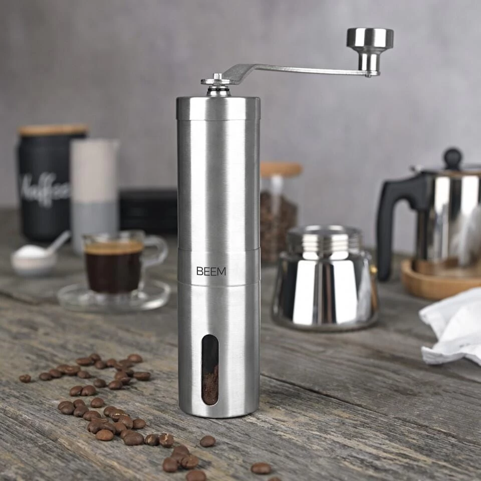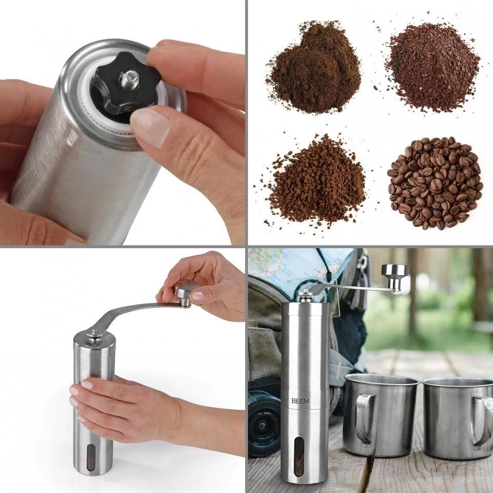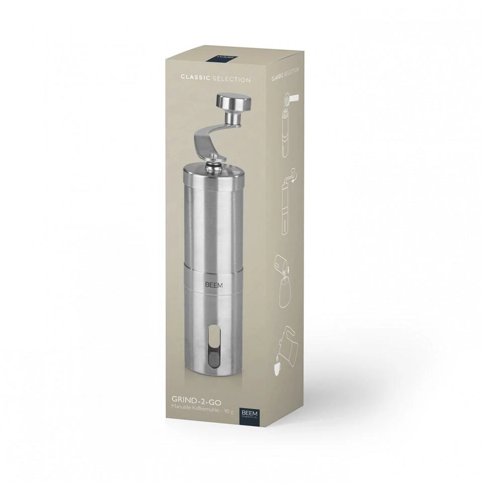 Genießer wissen: frisch gemahlen schmeckt Kaffee am besten! Mit der Grind-2-Go manuelle Kaffeemühle entlockst du den Kaffeebohnen im Handumdrehen feinstes Aroma. Dank des hochwertigen Kegelmahlwerks lässt sich der Mahlgrad stufenlos und für individuellen Bedarf optimal einstellen. Von Espresso (fein) bis French Press oder Filterkaffee (grob), alles ist stufenlos möglich. Strom, Batterie, Akku & Co. sind überflüssig, die handbetriebene Kaffeemühle Grind-2-Go ist stromunabhängig nahezu überall einsetzbar, z.B. beim Camping, Wandern oder im Urlaub, um nie auf das Aroma frisch gemahlener Bohnen zu verzichten. Mit ihrem ebenso zeitlosen wie puristischen Design integriert sie sich zudem harmonisch in jedes Ambiente. Das ist Kaffeegenuss für Stilbewusste!