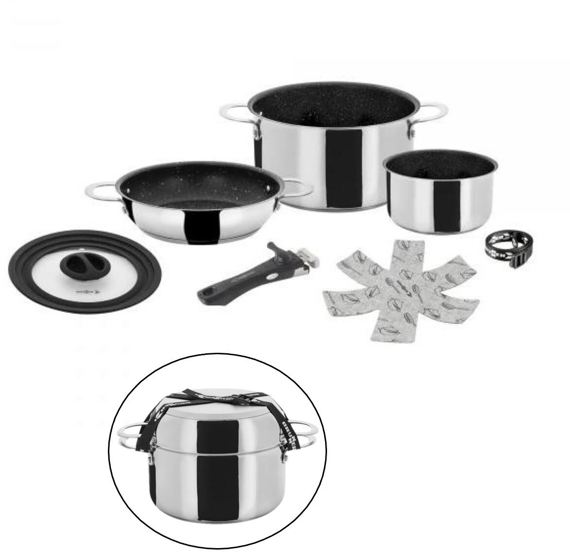 Qualitativ hochwertige Topfsetkollektion aus Edelstahl mit Antihaftbeschichtung. Platzsparendes Design, speziell für den Einsatz in Freizeitfahrzeugen und Booten geeignet. Der große Topf und die Pfanne besitzen feste Griffe und einen Thermoboden. Sie sind für Gas-, Elektro-, Keramik- und Induktionskochfelder geeignet. Spülmaschinengeeignet. Mit Vacublock-System.