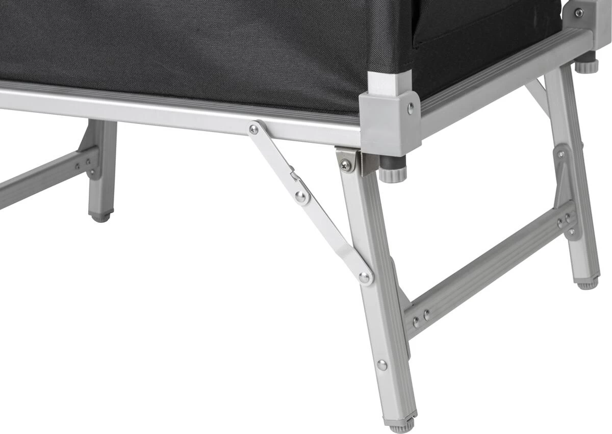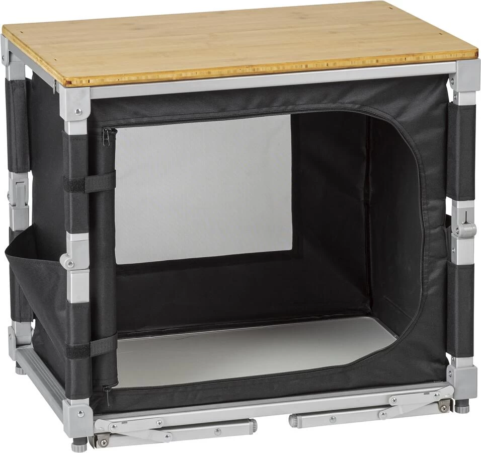 Tragbarer, klappbarer Küchenschrank mit völlig neuer, platzsparender Mountless-Aluminiumkonstruktion. Im Handumdrehen zu öffnen und zu schließen. Kochfläche aus Bambusholz. Komplett mit Stoffschrank zur Aufbewahrung des gesamten Kochzubehörs. Im zusammengeklappten Zustand sehr kompakt verstaubar und daher ideal für alle Kleinbusse, Vans und Wohnmobile. Komplett mit Aufbewahrungstasche.