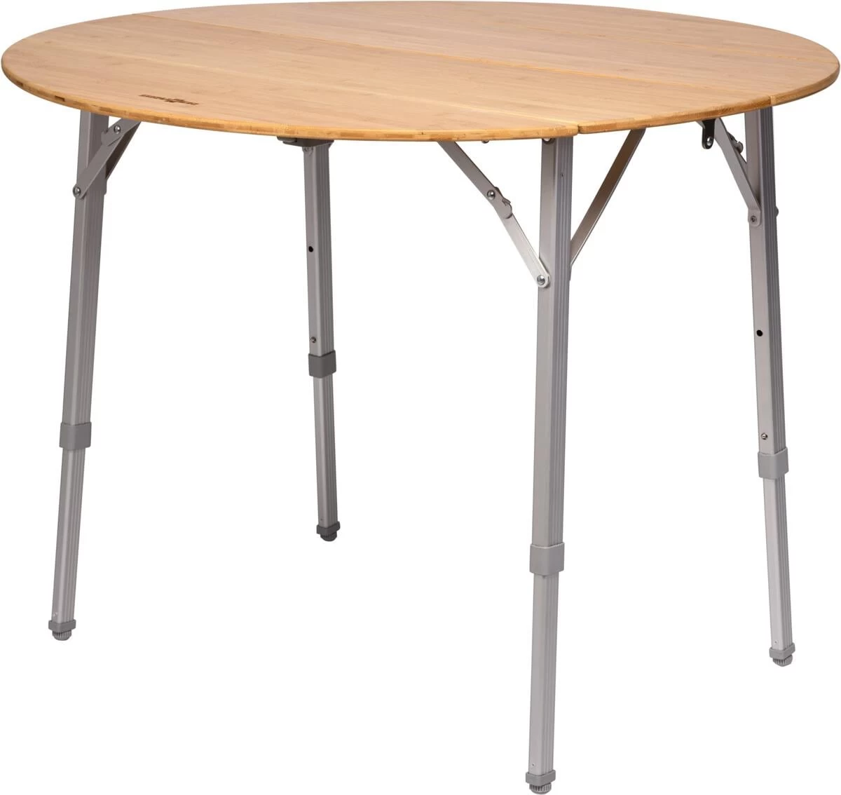 Runder Outdoor- und Campingtisch mit 4-fach klappbarer Tischplatte aus elegantem Bambusholz und höhenverstellbarem Gestell aus Aluminium. Sehr kompaktes Packmaß.