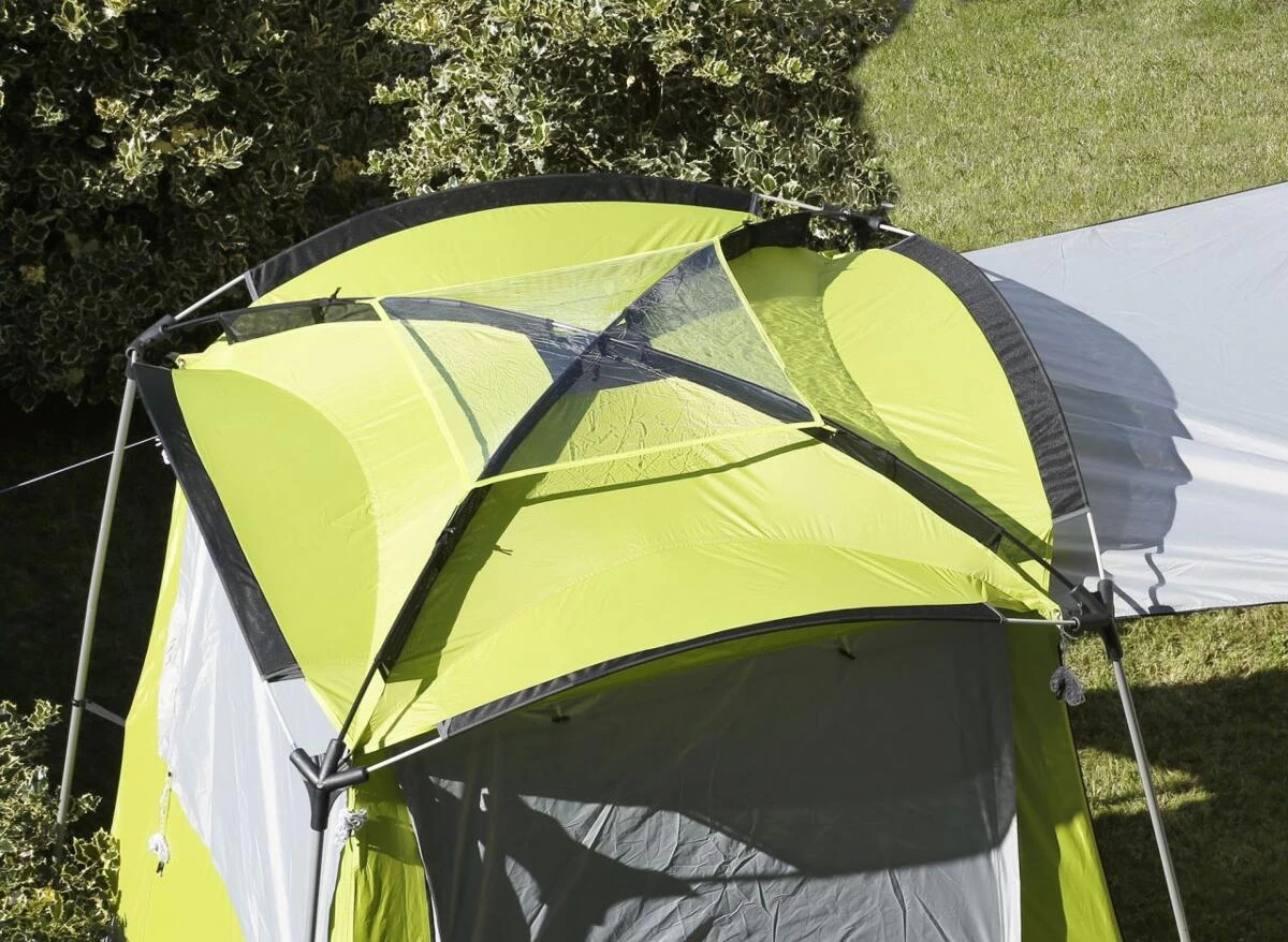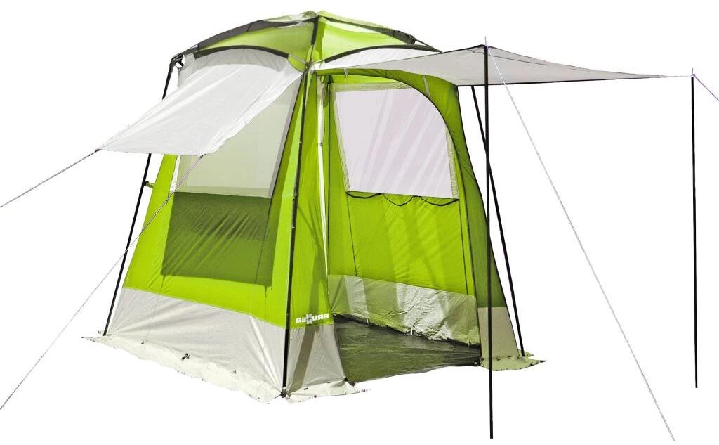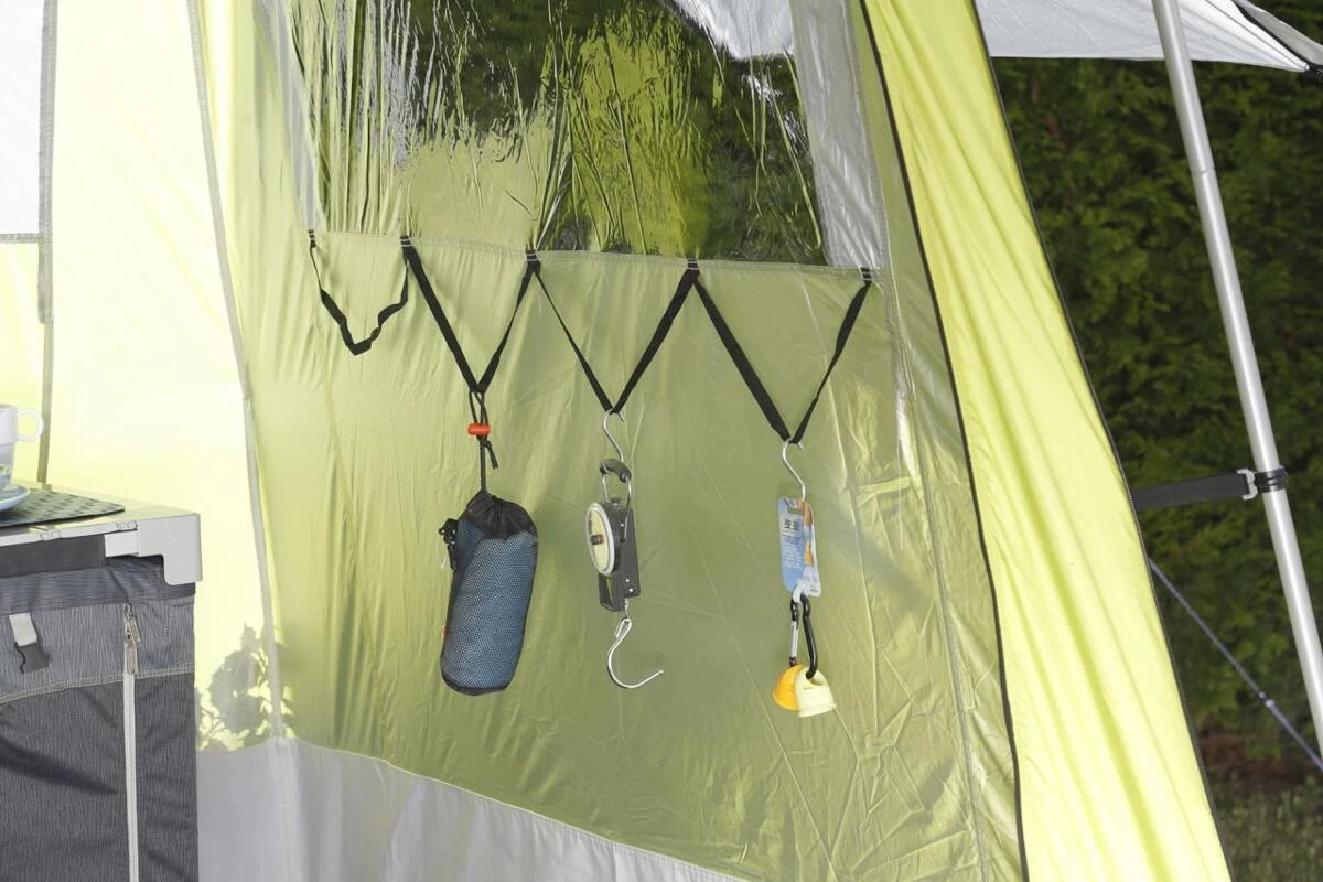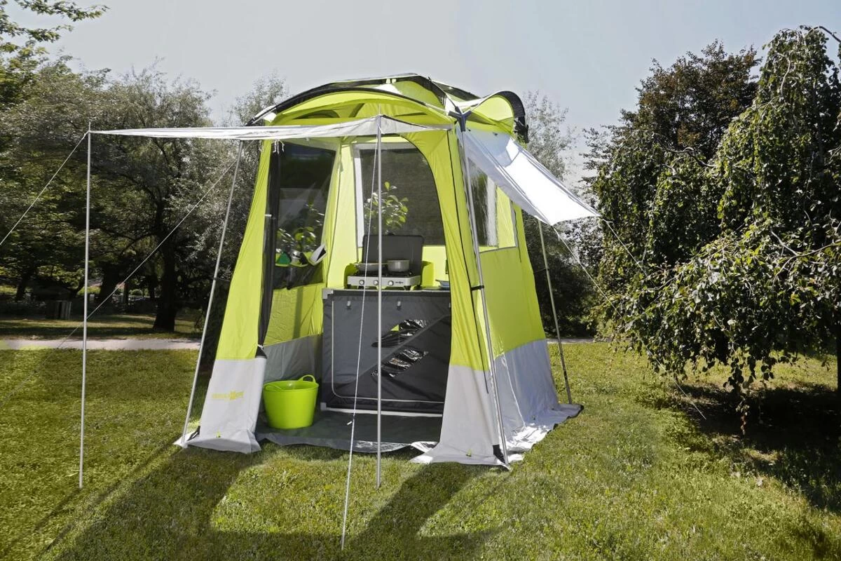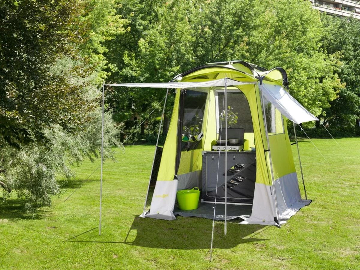 Modernes Küchen- und Gerätezelt in Leichtbauweise. Mit drei verdunkelbaren Gazefenstern, ausstellbarem Verandadach, Hochentlüftung und hochgezogenem Erdstreifen aus beidseitig beschichtetem Polyester UV-beständig. Komplett mit Packsack und Montagematerial.