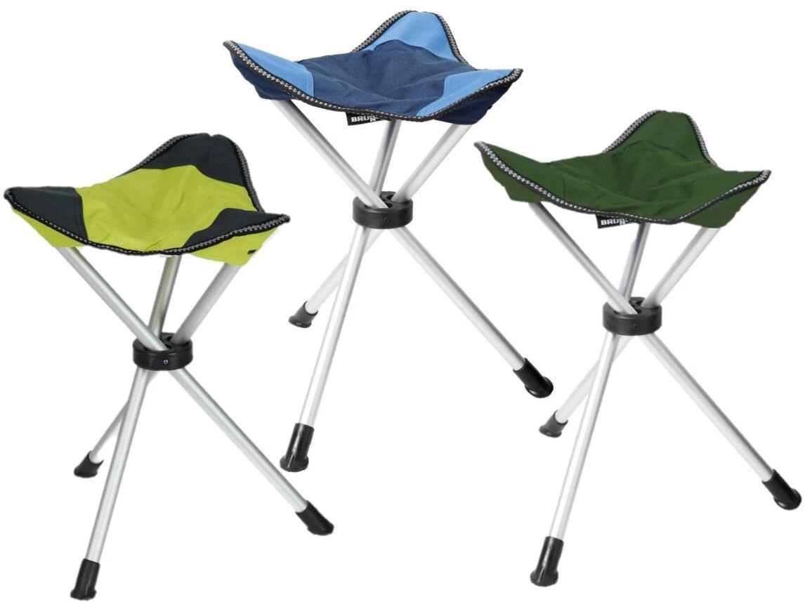 Dreibeinhocker mit klappbarem Gestell aus eloxiertem Aluminium und Polyesterbezug.