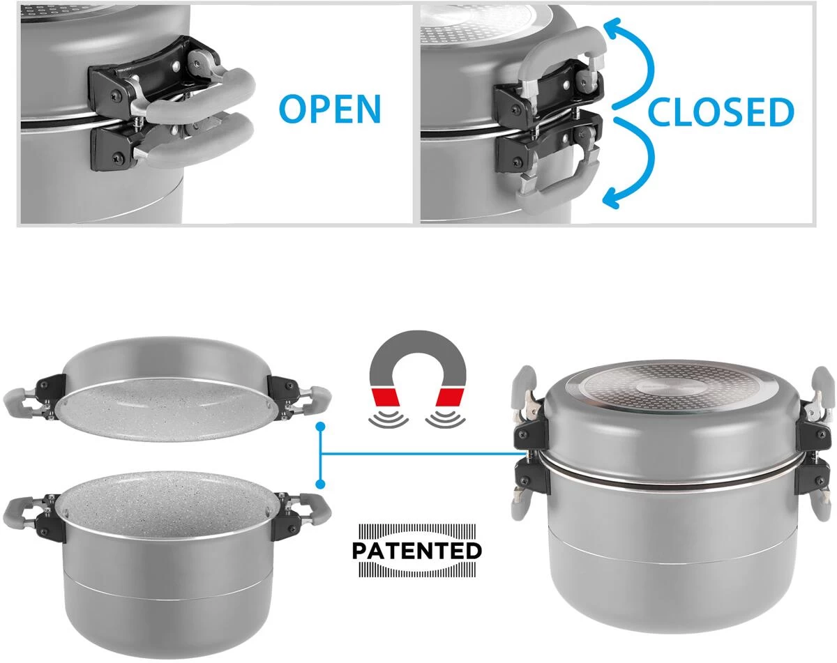 Das Fusion Magnetic Ceramic Kochtopf-Set im schlichten Design mit pattentierter Magnet Funktion, genannt MAGNETOGRIP SYSTEM. Ein Neu entwickeltes Griff- und Verbindungssystem, das durch die Verwendung von abklappbaren Griffen mit integriertem Magnetelement eine deutliche Verringerung des Packmaßes der Topfsets ermöglicht und zudem die Verwendung eines Zurrgurtes zur Stabilisierung von Topf und Pfanne während des Transportes unnötig macht.