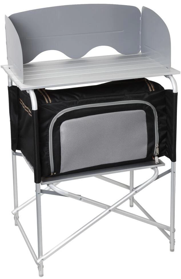 Dieser kompakt zusammenfaltbare Küchenschrank hat ein abnehmbares Staufach aus Polyester, das vor Reiseantritt z. B. mit Küchenutensilien befüllt werden kann und so dem Transport dient. Vor Ort wird es dann in das aus pulverlackiertem Metall bestehende Gestell eingehängt. Die rollbare Aluminium-Arbeitsplatte wird anschliessend aufgesteckt.
