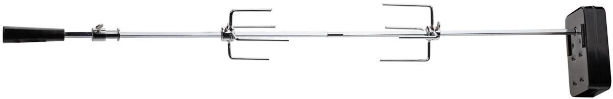 Der chrombeschichtete Drehspieß aus Stahl, mit hitzebeständigem Grill verfügt über einen batteriebetriebenen Motort (2 Batterien, Größe D, nicht inbegriffen). Das Motogehäuse besteht aus Edelstahl. Erhältlich für 3- oder 4-Brenner des Meridian oder Entertainer.