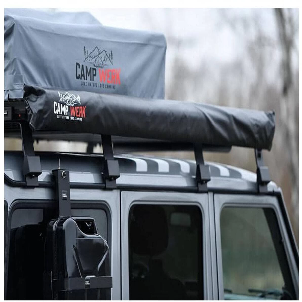Mit der Markise für dein Auto schaffst du dir an heißen Tagen einen kühlen Schattenplatz und wenn es regnet, einen trockenen Unterstand, unter dem der Regen nicht mehr ist als ein leises Geräusch auf dem Markisendach. Die Markise wird am Fahrzeug (Dachträger/Reling) montiert und lässt sich leicht ein- und ausrollen. Wird sie nicht gebraucht, kanns sie in der wasserdichten und schmutzabweisenden Schutzhülle verstaut werden, welche sich mit einem Reißverschluss öffnen und schließen lässt. Die Markise kann mithilfe von eingenähten Klettverschlüssen mit dem Seitengestänge verbunden werden, sodass sie auch an windigen Tagen kaum flattert.