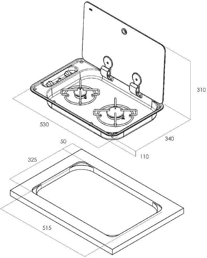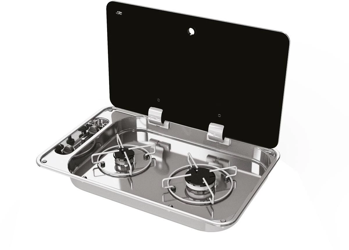 Rechteckiges Einbaukochfeld aus Edelstahl, Gaszufuhr mit 2 Brennern, Stützgitter aus Edelstahl, mit Schwingungsdämpfern befestigt. Schwarzer Hartglasdeckel mit verdeckten Scharnieren.