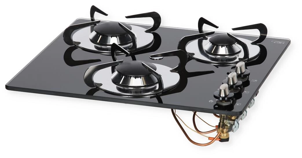 3-flammiger Einbaukocher mit temperaturbeständigem 8 mm Sicherheitsglas und Zündsicherung.