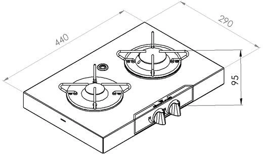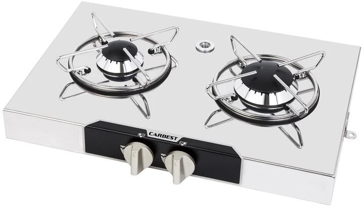 Hochwertiger Carbest Aufbau-Gaskocher 2-flammig mit Zündsicherung und manueller Zündung. Bedienelemente unten, 2-flammig, manuelle Zündung.