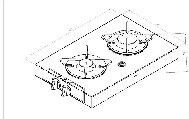 Hochwertiger Carbest Aufbau-Gaskocher 2-flammig mit Zündsicherung und manueller Zündung. Bedienelemente unten, 2-flammig, manuelle Zündung.