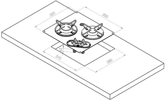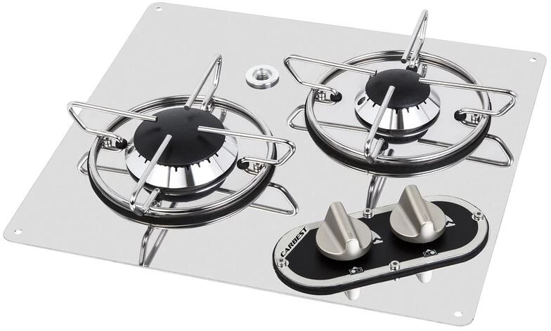Hochwertiger Carbest Einbau-Gaskocher 2-flammig mit Zündsicherung und manueller Zündung. Bedienelemente unten, 2-flammig, manuelle Zündung, Leistung: 1x 1,8 kW, 1x 1,0 kW, Gasverbrauch 204 g/h, 30 mbar, Gewicht: 2,5 kg.