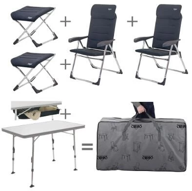 Das Crespo Stuhl- und Tischset Valencia besteht aus dem bereits bekannten Campingtisch mit verstärkter Tischplatte und zwei kompakten Klappstühlen. Bei diesem Set kann zwischen ungepolstert und gepolsters, sowie jeweils einer zusätzlichen Fußablage gewählt werden. Zudem ist ein praktisches Ablagenetz für den Tisch und eine passende Tragetasche für das gesamte Set dabei.