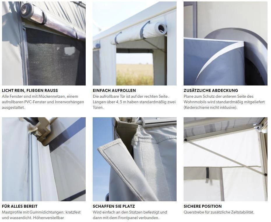 Mit dieser wasser- und windfesten Zeltüberdachung bleiben Sie bei jedem Wetter warm und trocken. Das Vorzelt kann von einer Person in weniger als 20 Minuten aufgebaut werden. Alle Fenster sind mit Mückennetzen, aufrollbaren PVC-Fenstern und Vorhängen ausgestattet. Die Verbindung der Seitenteile mit dem Frontteil erfolgt durch Klettverschluß.