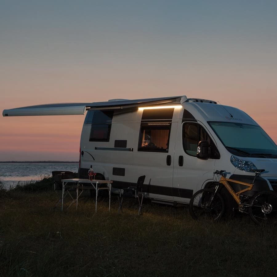 Das Phänomen der „automatischen Dusche” kennt jeder, der mal bei Regen die Schiebetür geöffnet hat. Weil das auf Dauer wenig Spaß macht, gibt’s von Dometic jetzt eine stabile Nachrüst-Regenrinne für Kastenwagen. Sie leitet das Regenwasser seitlich ab und ist zudem mit einer LED-Lichtleiste ausgestattet. Damit löst sie sehr elegant das Problem einer fehlenden nächtlichen Außenbeleuchtung!