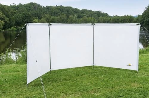 Die Außenstangen werden durch feste Hohlsäume geführt, die 2 inneren Stäbe mit Klettbändern am Gewebe befestigt. Die waagrechten Spannstäbe werden durch Hohlsäume geführt und verleihen dem Windschutz Stabilität.