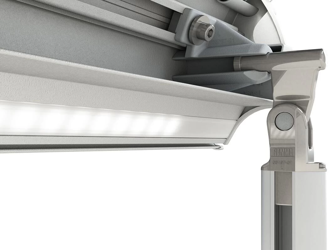 LED-Beleuchtungskit speziell für die Markisen F65 und F80 bestehend aus einem 5 m langen LED-Klebestreifen. Einfach und schnell auf die Wunschlänge kürzbar. Serienmäßig mit zehn Lichtpunkten aus 50 cm PVC ausgestattet, die in das Innenprofil der Frontblende eingesetzt werden.