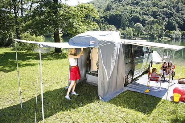 In wenigen Handgriffen montiert, mit seitlichen Abschlüssen und aufrollbarer Front für noch mehr Dichte. Obere Spannstange Rafter und Kederleiste, um die Spannung zu halten. Die Doppelkederschiene wird an der Dachtraufe des Ducato angebracht, die Aluminiumspannstange Rafter blockiert die Öffnung der doppelten Hecktür und spannt dabei das Sonnendach.