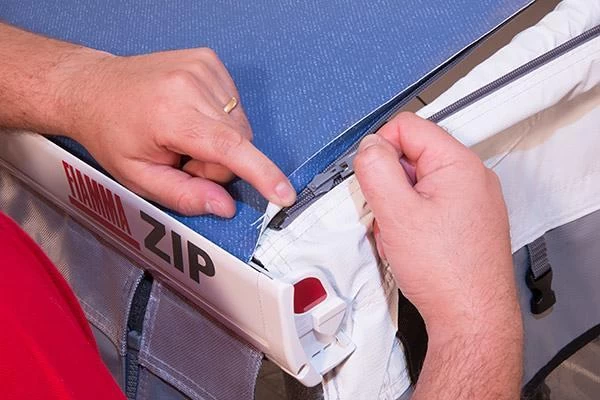 Die Markise basiert auf der F45. Das Tuch ist für eine einfache und schnelle Montage mit dem Reißverschlusssystem ZIP ausgestattet.