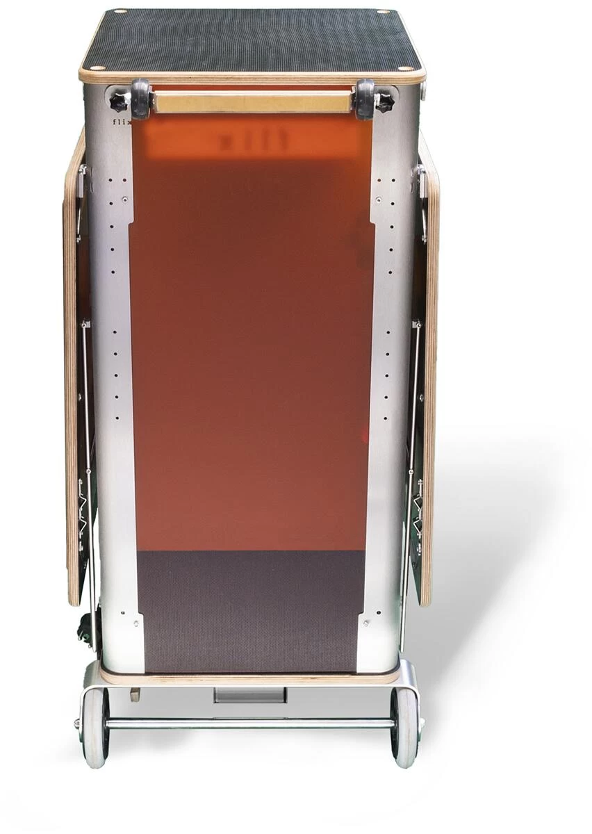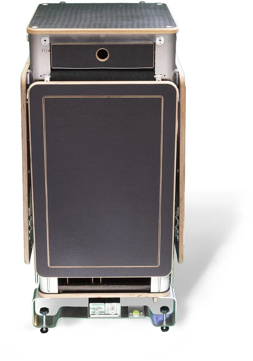 Elektrische Pumpe, Abwasserbehälter? Gibt es bei uns nicht – denn solche Teile sind wenig leistungsfähig, kompliziert und hygienisch problematisch. Bei uns gibt´s eher so richtig praktisch-clevere Dinge, wie zB den integrierten Seifenspender oder den flexibel feststellbarem Schlauch, Die Wasserstation können Sie an einer beliebigen Seite des Camper festmachen, auch die Ausrichtung des Auslaufs ist beliebig. Die komplette Station ist im Lieferumfang enthalten. Ein großes schwarzes Schneidebrett aus lebensmittelechtem Kunststoff gehört zur Grundausstattung des Live Camper. Sehr clever: Unter dem Schneidebrett werden 6 GastroNorm-Boxen eingehängt. Das Schneidgut wird direkt vom Brett in die Box geschoben – praktischer geht´s nicht. Auch zum Lagern der geschnittenen Zutaten optimal. Schneidebrett, Boxen & Deckel gehören zum Lieferumfang. Viele Campingplätze bieten eine Stromversorgung – Live Camper ist mit einer wassergeschützten Steckdosenleiste ausgestattet, so daß Sie mehrere Geräte betreiben können. Im Korpus von Live Camper findet die Grundausstattung leicht Platz – auch ein Herd, ein Grill oder eine Gasflasche können hier noch zusätzlich untergebracht werden. Extrem stabile Industrieklett-Bänder und flexible Zwischenwände sorgen für Ordnung und einen geräuscharmen Transport. Damit flix Camper auch bei einseitiger Belastung stets sicher steht, gibt es ganz unten 2 Zusatzgewichte.Wenn man die Küche fürs Ein- und Ausladen leichter machen möchte, nimmt man sie einfach heraus.