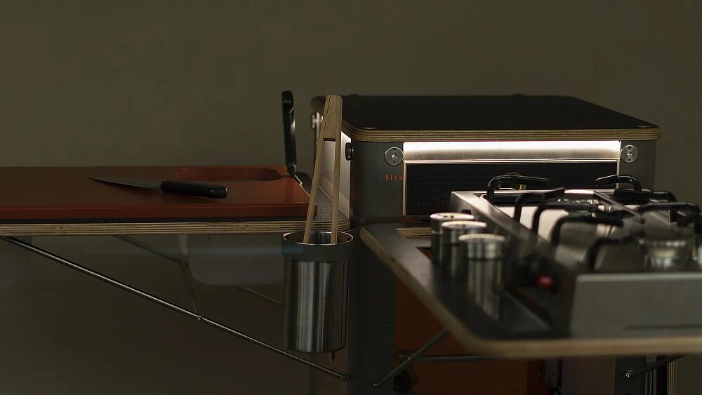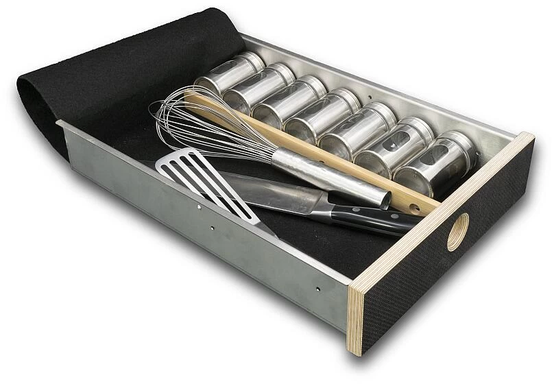 Für viele Camper ist das Kochen und Essen ein Highlight des Tages – schade, dass viele Küchen nicht nur klein, sondern oft auch unpraktisch sind. Unterwegs richtig gut kochen: das geht mit flix Live Camper. Denn Camper basiert auf GastroNorm (GN) – dem internationalen Gerätestandard der Profis. Egal ob Vorbereiten, Kochen oder Grillen. genormte Gastro-Geräte und -Behälter sorgen für Ordnung und Flexibilität – alles in bester Profi-Qualität. Damit Sie unterwegs so gut kochen können wie zu Hause. Die kräftige LED-Beleuchtung ist fest eingebaut. Sie ist viel mehr als nur Deko, denn sie ermöglicht gutes Arbeiten auch im Dunkeln. Strom kommt entweder von der ebenfalls eingebauten Steckdose, oder von Ihrer Powerbank. Beleuchtung, Netzgerät und Converter (verwandelt 5V der Powerbank in 12V für die LED) sind im Lieferumfang enthalten. In der Schublade befinden sich 7 edle Gewürzdosen (im Lieferumfang enthalten), und natürlich Ihre Werkzeuge und Messer (nicht enthalten). Damit unterwegs nichts klappert, ist die Schublade komplett mit stabilem Filz ausgekleidet. Wenn Sie den Front-Flügel benutzen, können Sie vielleicht die Schublade nicht mehr öffnen. Deswegen nehmen Sie vorher die Gewürze & Werkzeuge heraus – oder direkt die ganze Schublade. Küchenutensilien wie Schneebesen, Kelle und Sieb hängen Sie an dieser Leiste auf. Der Wasserkanister für die Wasserstation wird an der Rückseite eingehängt. Die Befestigung der Leiste erfolgt – per Hand – mittels zweier Rändelschrauben an einer beliebigen Seite des Campers. Die Leiste sowie 2 Haken sind im Lieferumfang enthalten. Die Wasserstation ist auf echtes Arbeiten ausgelegt: ein großer 12-Liter Kanister, 2 GastroNorm (GN) Becken und ein GN Abtropfblech liefern alles, was man zum Waschen und Putzen braucht. Gebrauchtes Wasser entsorgen Sie ganz einfach nach draußen.