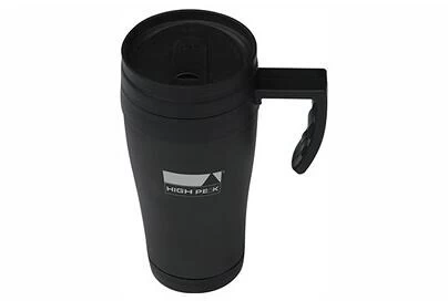 Doppelwandiger Thermobecher mit Griff und Deckel mit Trinkverschluss. Aus robustem Edelstahl. Hält Getränke lange heiß oder kalt. Der komfortable Griff sorgt für ein einfache Handhabung.
