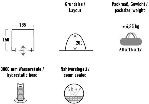 - Maße: L180 x B150 x H200 cm