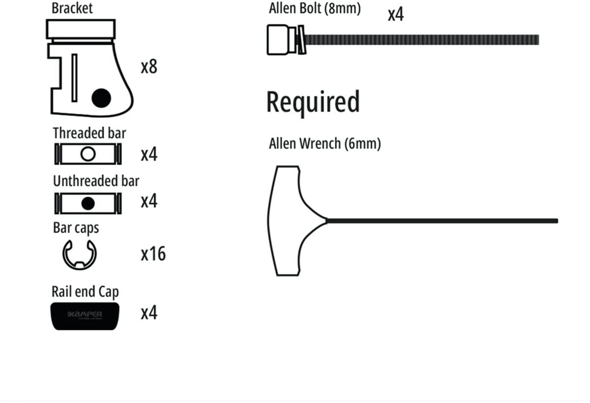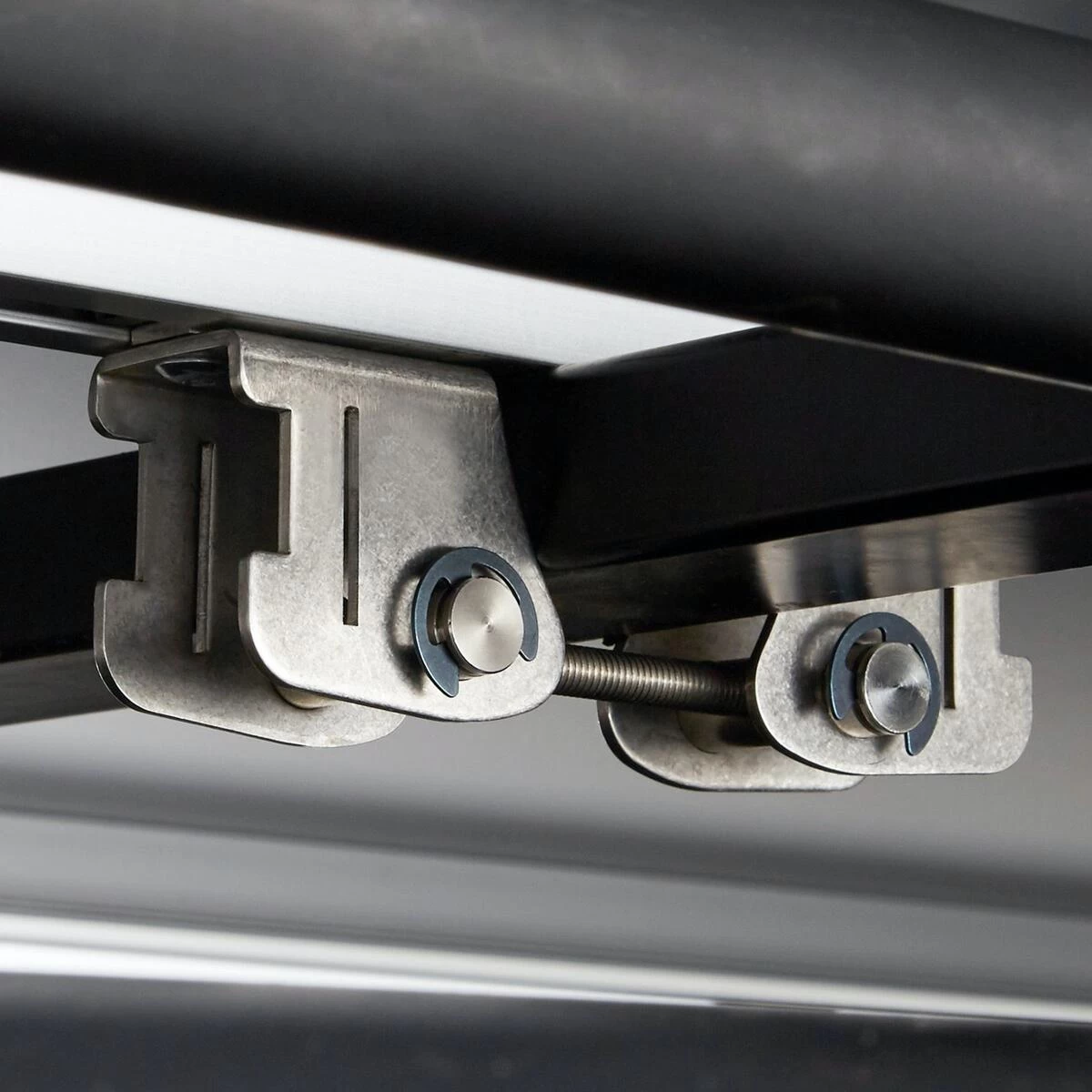 Hinweis: Jedes iKamper-Dachzelt wird mit Montagehalterungen 2.0 geliefert. Die Montagehalterungen 2.0 sind mit einer maximalen Querträgerhöhe von 3 cm und einer Breite von 9 cm kompatibel. Wenn das Fahrzeug höhere Querträger hat, bitte die Montagehalterungen 1.0 verwenden.