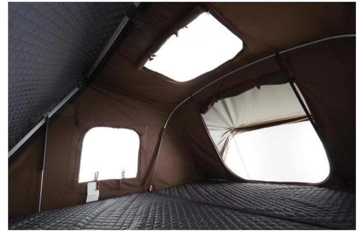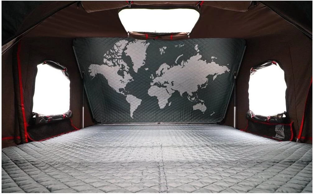 Um die Aussicht aus luftiger Höhe zu genießen, verfügt das Skycamp Dachzelt rundherum über große Fenster. Alle sind mit einem sehr feinen, robusten Mosquitonetz, einem von innen verschließbaren Wetterschutz, sowie speziellen Überdachungen, die das Durchlüften auch bei starkem Regen ermöglicht, ausgestattet. Einzigartig ist das Panorama-Dachfenster, das nachts den Blick auf die Sterne ermöglicht oder tagsüber das Zelt erhellt. Für Langschläfer verfügt das Dachfenster selbstverständlich über eine von innen verschließbare Stoffabdeckung. Die integrierte Matratze im Kingsize Format bietet mit einer Schlaffläche von 190 x 210 cm Platz für bis zu 4 Personen und ist durch ihr spezielles Luftkammerfutter nicht nur besonders bequem sondern auch atmungsaktiv und gehört zu den hochwertigsten Matratzen im Bereich Camping. Trotz ihrer schlanken Form verfügt sie über eine starke Dichte und schmiegt sich dem Körper schön an. Als kleines Highlight wurde die Innenseite der Hartschale ebenfalls mit Luftkammerfutter bezogen worauf eine textilbedruckte Weltkarte abgebildet ist. Diese sorgt für eine gemütliche Atmosphäre und lässt schon von den nächsten Urlaubszielen träumen.
