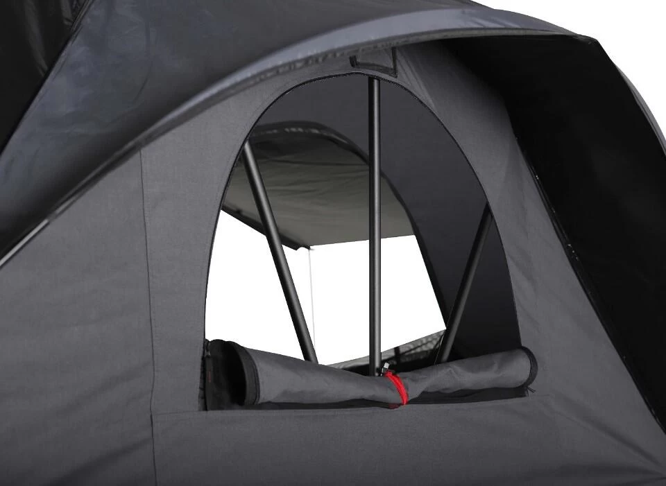 Der neue dunkelgraue Canvas verschmilzt mit dem schwarzen Tropendach zu einem zeitlosem Design. In geöffnetem Zustand ist das Zelt 307 x 287 cm groß und hat eine Schlaffläche von 227 x 175 cm. Die Aluminium-Bodenplatte lässt sich zu einer riesigen King-Size-Fläche ausklappen und die superbequeme und dicke Premium-Matratze sorgt für angenehmen Schlaf. Um die Aussicht aus luftiger Höhe zu genießen, verfügt das X-Cover Dachzelt rundherum über große Fenster. Das neue, gebogene Fenster-Design ermöglicht es, die Regenüberdachung einfach vom inneren des X-Covers zu spannen und aufzustellen. Alle sind mit einem sehr feinen, robusten Mosquitonetz, einem von innen verschließbaren Wetterschutz und speziellen Überdachungen, die das Durchlüften auch bei starkem Regen ermöglichen, ausgestattet. Einzigartig sind die 2 Panorama-Dachfenster, die nachts den Blick auf die Sterne ermöglichen oder tagsüber das Zelt erhellen. Für Langschläfer verfügen die Dachfenster selbstverständlich über eine von innen verschließbare Stofflage.