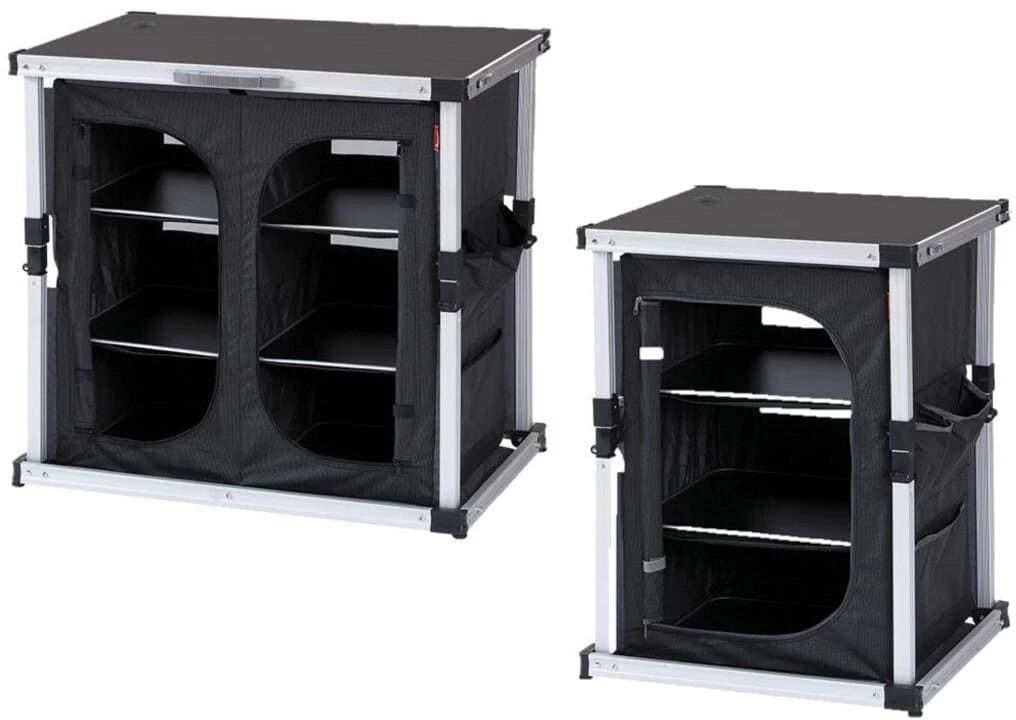 Für alles bestens gerüstet sind Sie auf jeden Fall mit der Isabella Möbelserie. Praktisch sind die eingearbeiteten Lüftungsgitter und der Klett, mit dem sich die aufgerollten Türen fixieren lassen sowie die höhenverstellbaren Füße zum Ausgleichen von Bodenunebenheiten. Die Oberflächen sind sehr wertig und mit Aluminium eingefasst, was diese auch stoßfest macht, zudem sind alle Oberflächen und auch der Bezug (besteht zu 60 % aus PVC und 40 % Polyester) sehr leicht zu reinigen. Ein stabiler, einfacher und intuitiver Klapp-Mechanismus sorgt dafür, dass die Möbel rasch aufgebaut sind und im Urlaub keine Zeit verloren geht. Durch das Konstrukt aus Aluminium und Kunststoff sind die Möbel nicht nur stabil und belastbar, sondern auch sehr leicht. Zudem ist im Lieferumfang eine praktische Transporttasche mit Griffen zum leichten Verstauen enthalten. Mit 6 Ablageböden.