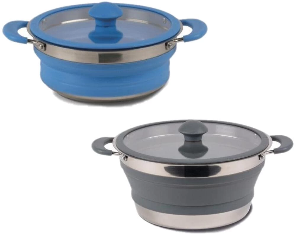 Kochen Sie einen Leckerbissen und sparen Sie wertvollen Platz auf Ihrer Campingreise mit klappbaren Kochutensilien aus Edelstahl.