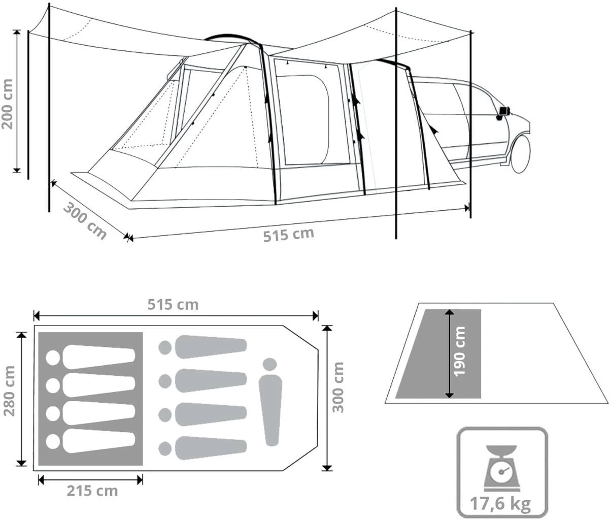- Maße Außenzelt: 515x300x200 cm (LxBxH)