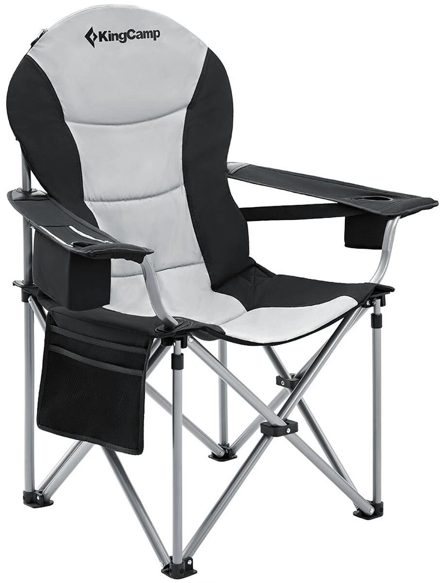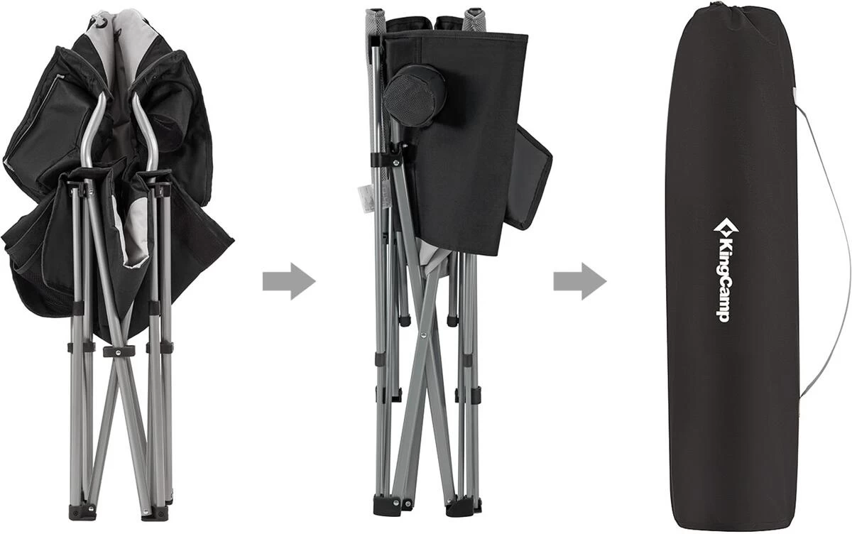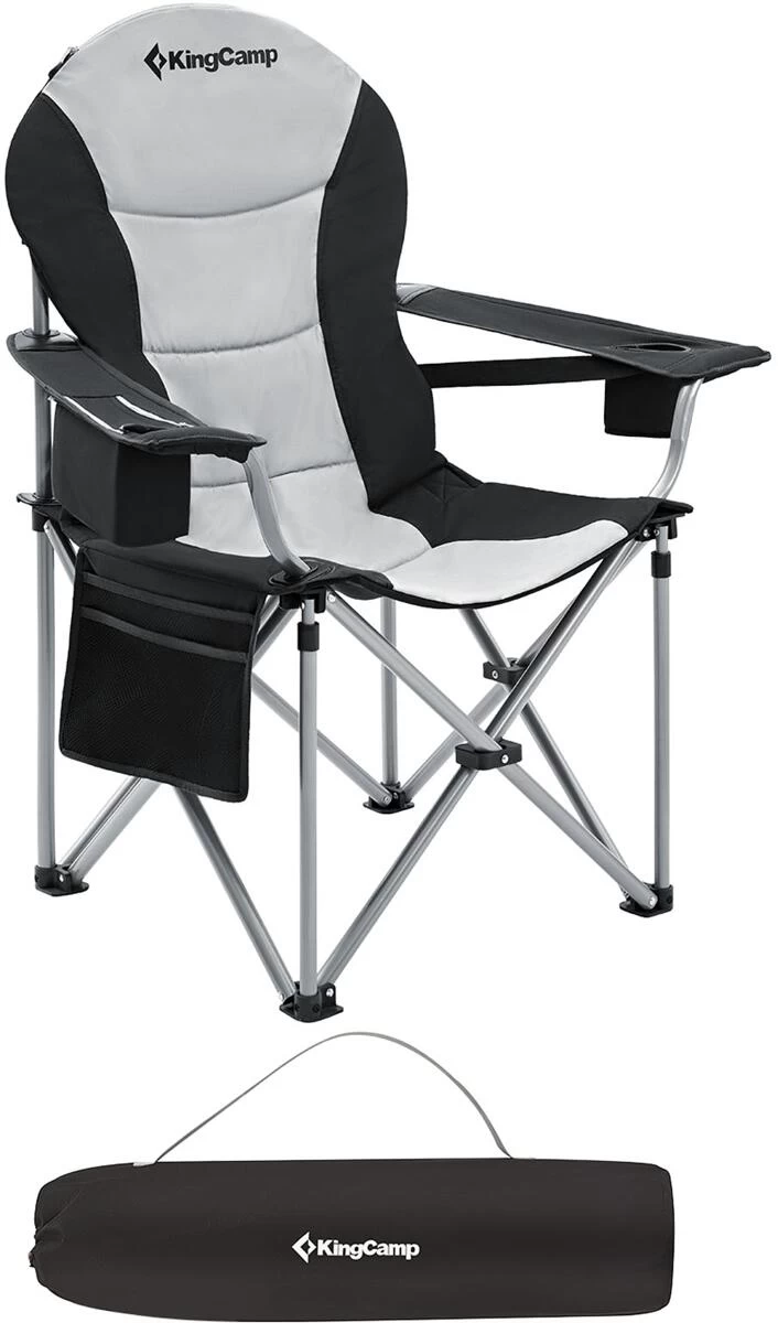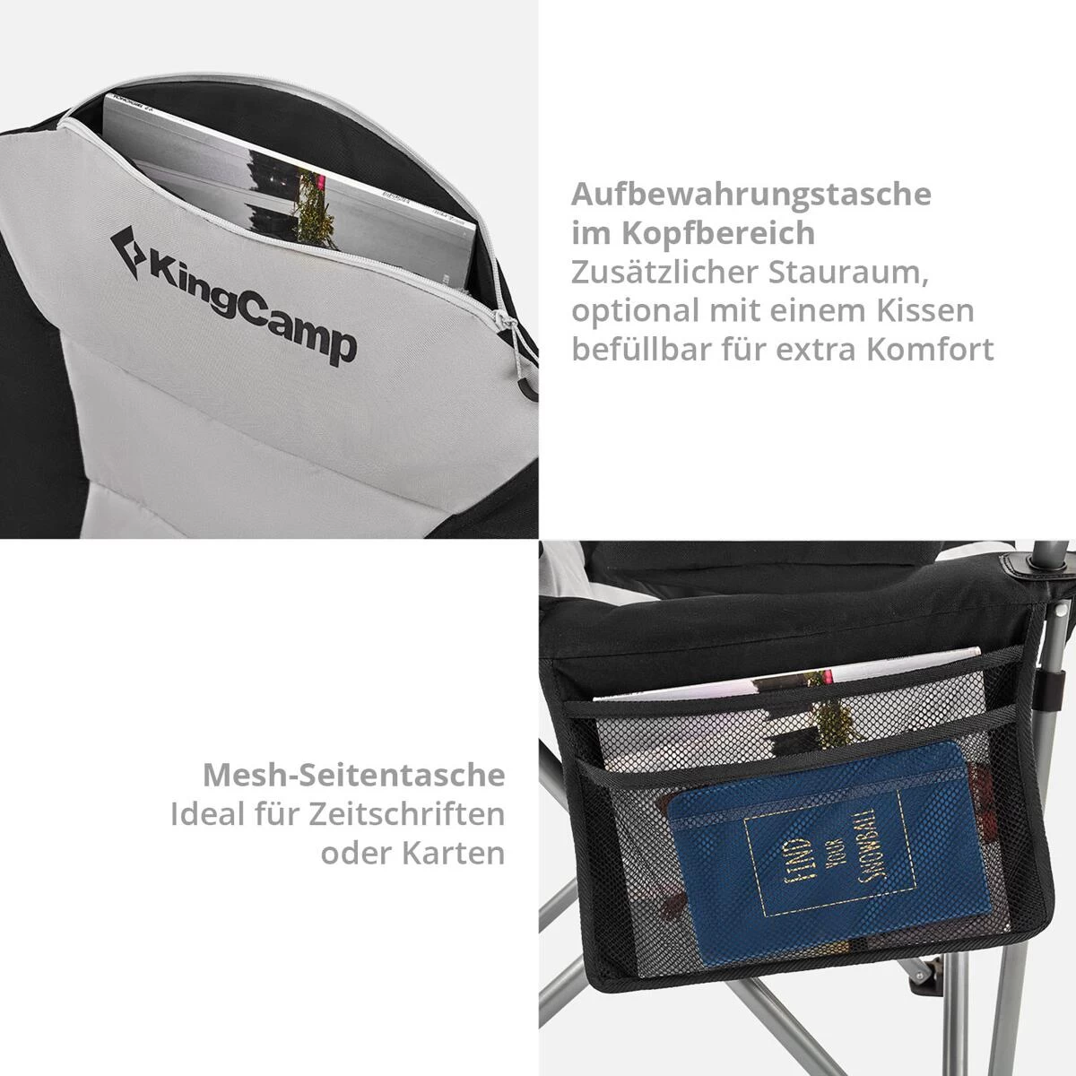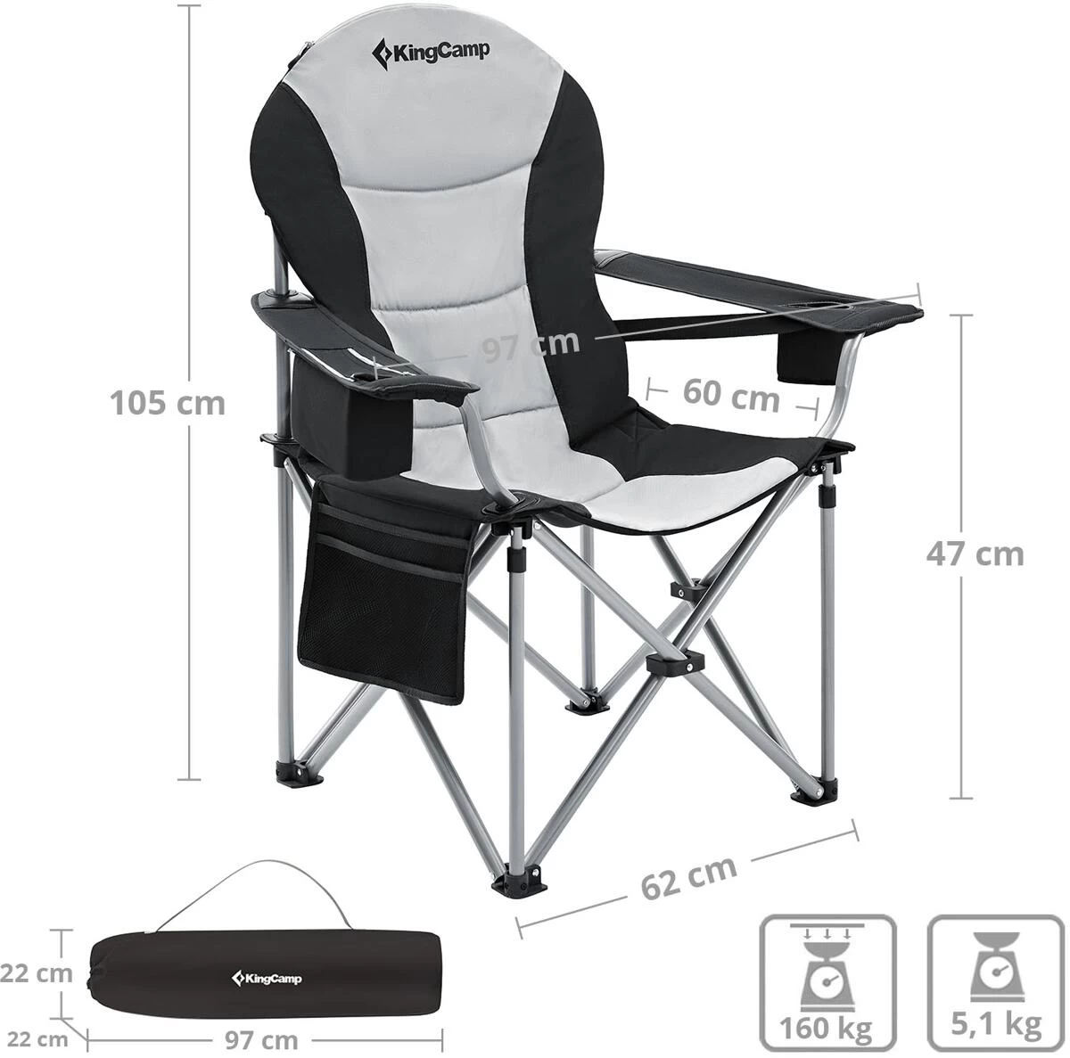 Dieser Stuhl lässt keine Wünsche unerfüllt! Dank seines robusten Stahl-Gestänges verfügt er über eine Belastbarkeit von 160 kg. Eine anpassbare Rückenlehne, die Sie mittels eines Gurtes optimal an Ihre Bedürfnisse anpassen können, der praktische Getränkehalter, die seitliche Kühltasche und eine weitere Tasche auf der Rückseite sind an Funktionalität kaum zu übertreffen. Trotz der Größe lässt sich dieser hochwertige Campingstuhl auf ein geringes Packmaß zusammenfalten und findet so in jedem Kofferraum Platz – und dank der großzügigen Tragetasche lässt er sich problemlos transportieren.
