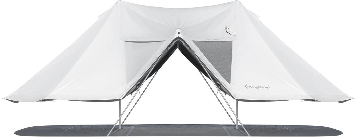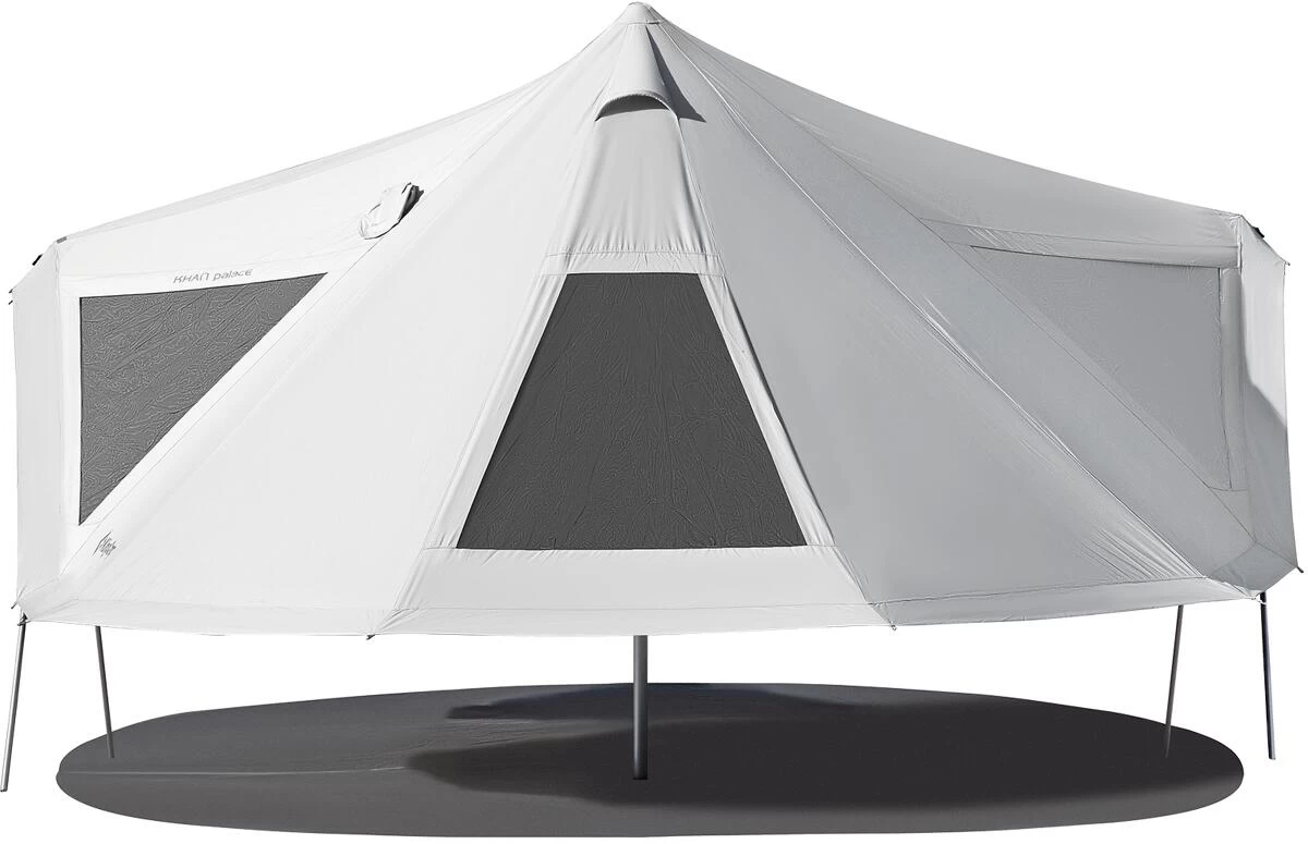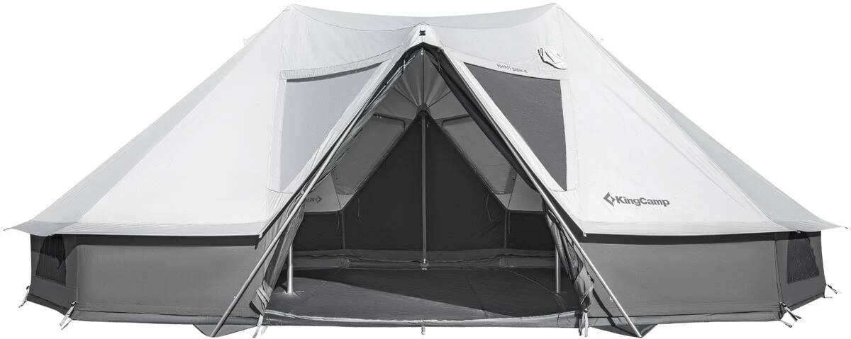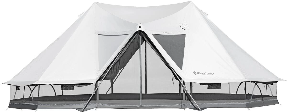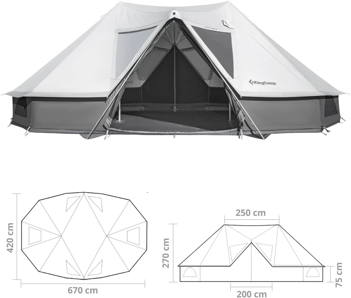 Mit dem Khan Palace präsentiert KingCamp ein luxuriöses Gruppen-Zelt, das dank seiner klassischen Form mit einem ganz besonderen Glamping Flair aufwartet. Trotz seiner stattlichen Ausmaße ist das Khan Palace schnell aufgebaut und kompakt zu verstauen. Die verschiedenen Aufbauoptionen bieten Ihnen maximale Flexibilität. Speziell der Aufbau ohne Baumwoll-Außenwände und nur mit Mesh-Seitenwänden bietet eine einzigartige und sehr komfortable Option an heißen Tagen die bisher nur bei den Khan Zelten möglich ist und eine optimierte Belüftung mit dem Schutz vor Insekten verbindet. Natürlich ist auch bei allen anderen Aufbauoptionen dank der eingebauten Dachbelüftung ein angenehmes Innenklima mit hervorragender Frischluftversorgung. Für ein angenehmes Raumgefühl sorgen die 270 cm Stehhöhe sowie die beiden weit zu öffnenden, großen Eingänge die mit aufrollbaren Vorhängen verschlossen werden können. Viel Licht ins Innere bringen die 6 großen Dachfenster die bei Bedarf ebenfalls mit Vorhängen verschlossen werden können. Hinzu kommen für noch mehr Licht und Ventilation 4 bodentiefe D-Fenster mit Moskito-Mesh. Eine weitere Besonderheit sind die zwei Schornstein Ausgänge mit Regenabdeckung die mit feuerresistentem Material versehen wurden und Ihnen eine Entlüftung beidseitig ermöglichen. Mehrere Organizer-Taschen und Haken zum Aufhängen von Laternen oder Ausrüstung an den großen Stangen sorgen für Ordnung im Zelt. Die extra starke technische Baumwolle (80% Polyester, 20% Baumwolle) mit PU-Beschichtung verbessert das Innenzeltklima, ist wasserabweisend und bietet eine erhöhte Reißfestigkeit. Besonders in eher feuchten Breiten, ist dieses Mischgewebe von Vorteil. Die robusten Nylon Reißverschlüsse, die gebogenen Heringe und die extra starken Abspannseile erhöhen sowohl die Windstabilität als auch die Langlebigkeit. Der kinderleicht mit einem Reißverschluss zu befestigende Boden schützt verlässlich vor Bodenfeuchtigkeit und ist nach Gebrauch leicht zu reinigen. Ob auf Glamping-Trips, Festivals oder bei Events – mit dem Khan Palace sind Sie gerade für große Gruppen ideal ausgerüstet.