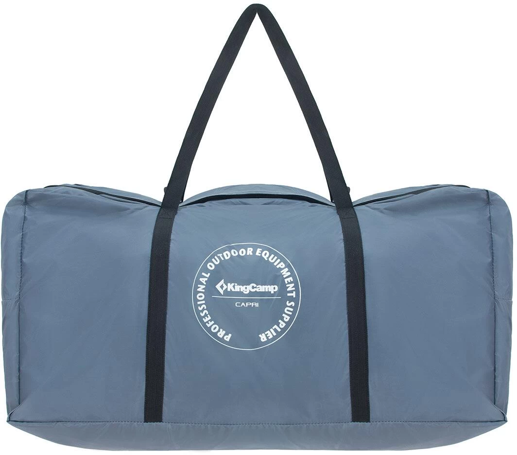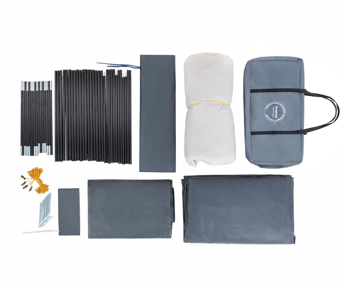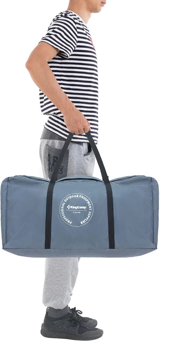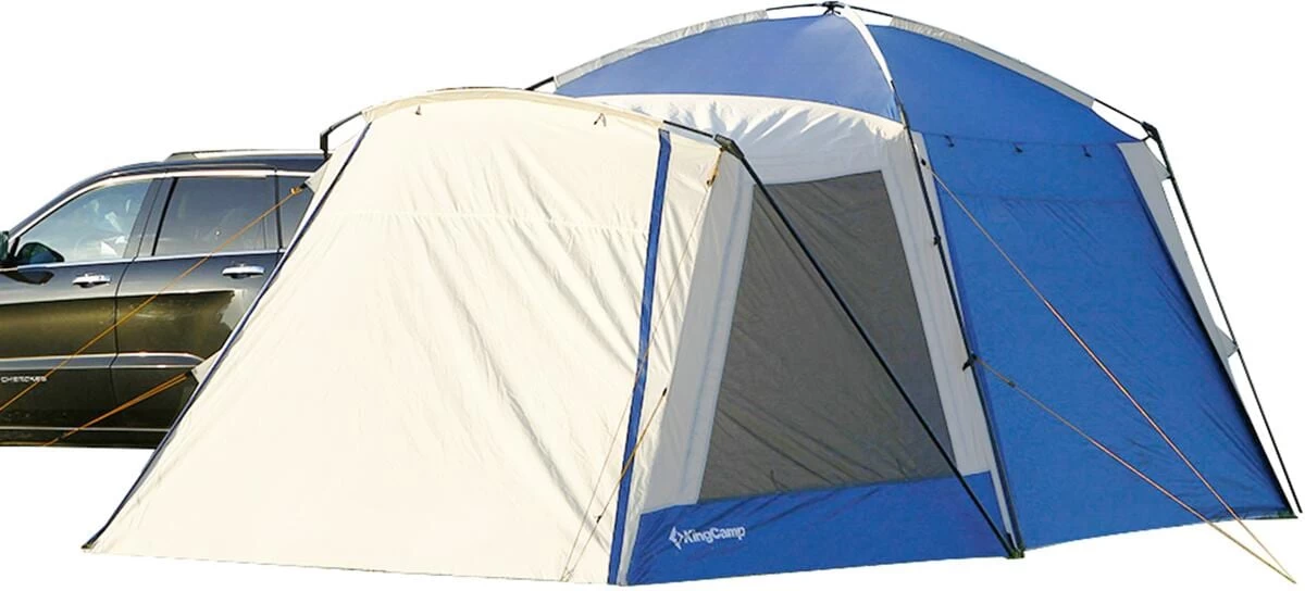 KingCamp präsentiert mit dem Modell Meilfi Plus ein modernes, freistehendes Familienzelt mit optimaler Raumnutzung und 220 cm Stehhöhe. Die Besonderheit des Meilfi Plus ist seine Funktion als Heckzelt für Busse oder SUV. Über eine Schleuse kann so jederzeit Zugriff auf den Kofferraum genommen werden. Das Zelt besitzt einen Vorraum mit Klarsicht-Fenstern (+ Gardinen) und 2 als Sonnensegel verwendbare Eingänge. Das Innenzelt ist mit einem fest eingenähten Boden ausgestattet und verfügt über eine praktische Kabeldurchführung, eine Laternenaufhängung sowie platzsparende Organizer-Taschen. Die robusten Reißverschlüsse, die Nahtversiegelung sowie die PU Beschichtung mit 3000 mm Wassersäule ermöglichen ein komfortables Campingvergnügen. Das Zelt kann auch ohne Fahrzeug stehen bleiben und muss somit bei Ausflügen nicht zwangsläufig abgebaut werden.