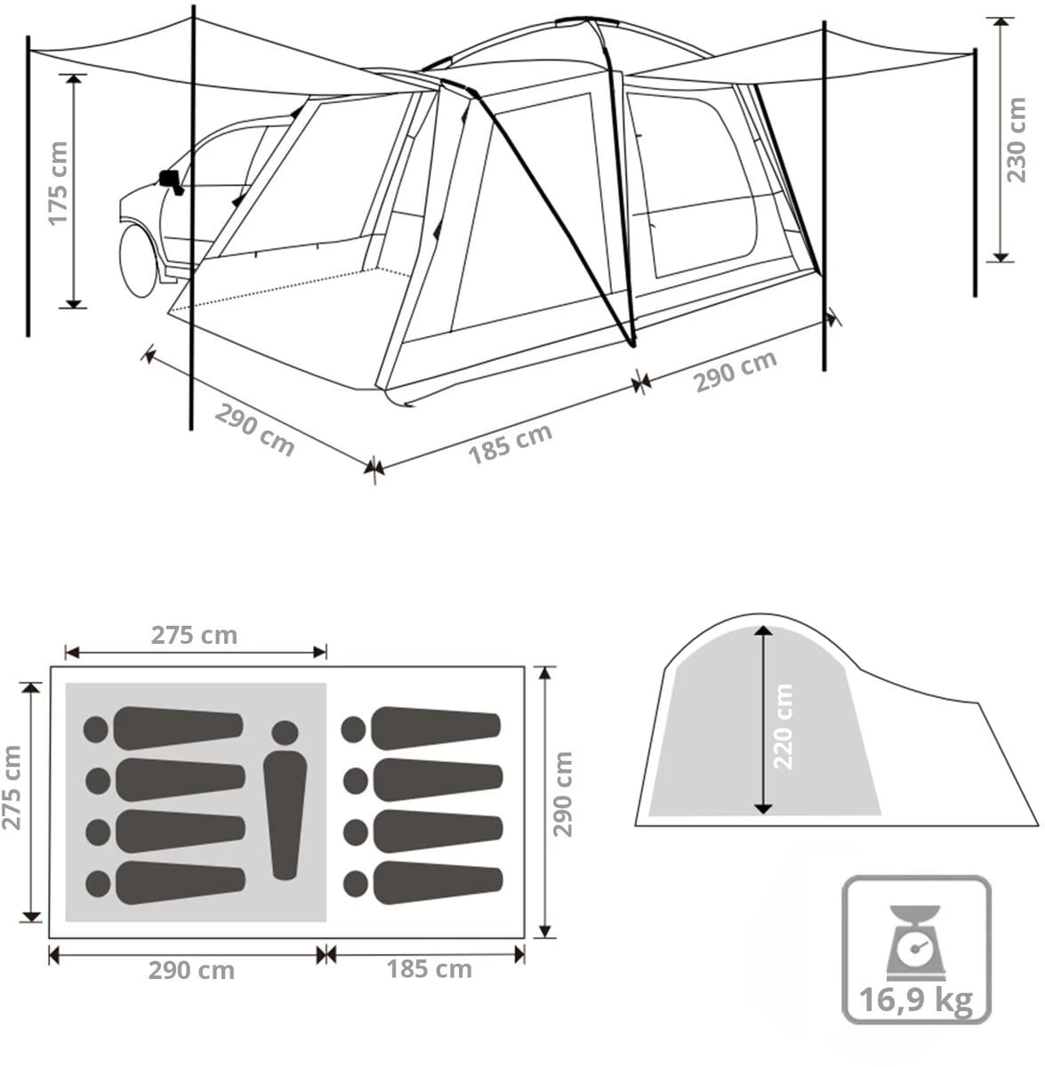 - Maße Außenzelt (L x B x H): 475 x 290 x 220-175 cm