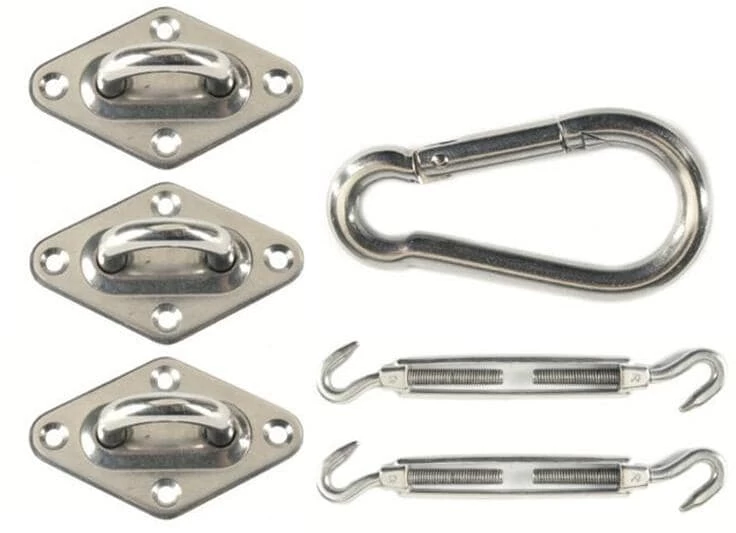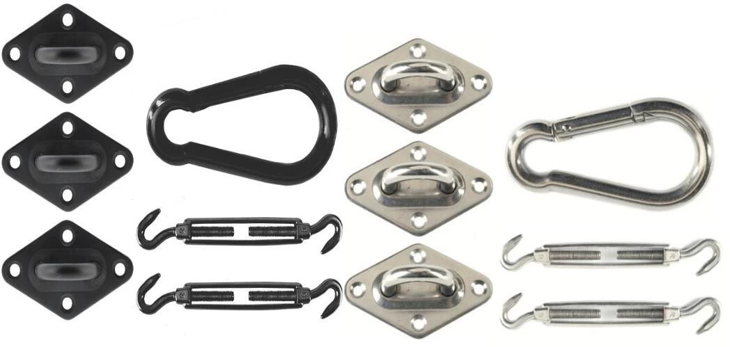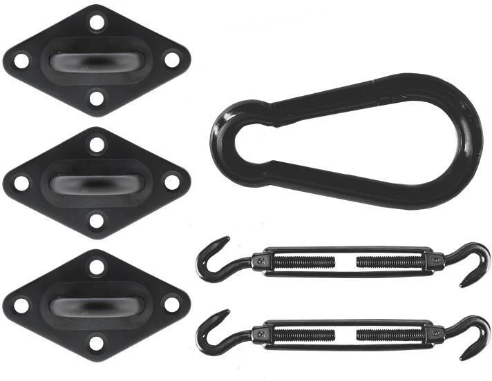 Um möglichst lange Ihr Schattentuch genießen zu können, ist es wichtig, dass Sie es richtig befestigen. Mit diesem praktischen Montageset können Sie es im Handumdrehen anbringen. Das Montageset enthält einen Karabinerhaken, zwei Schraubenschlüssel und drei Befestigungsplatten mit Ösen.
