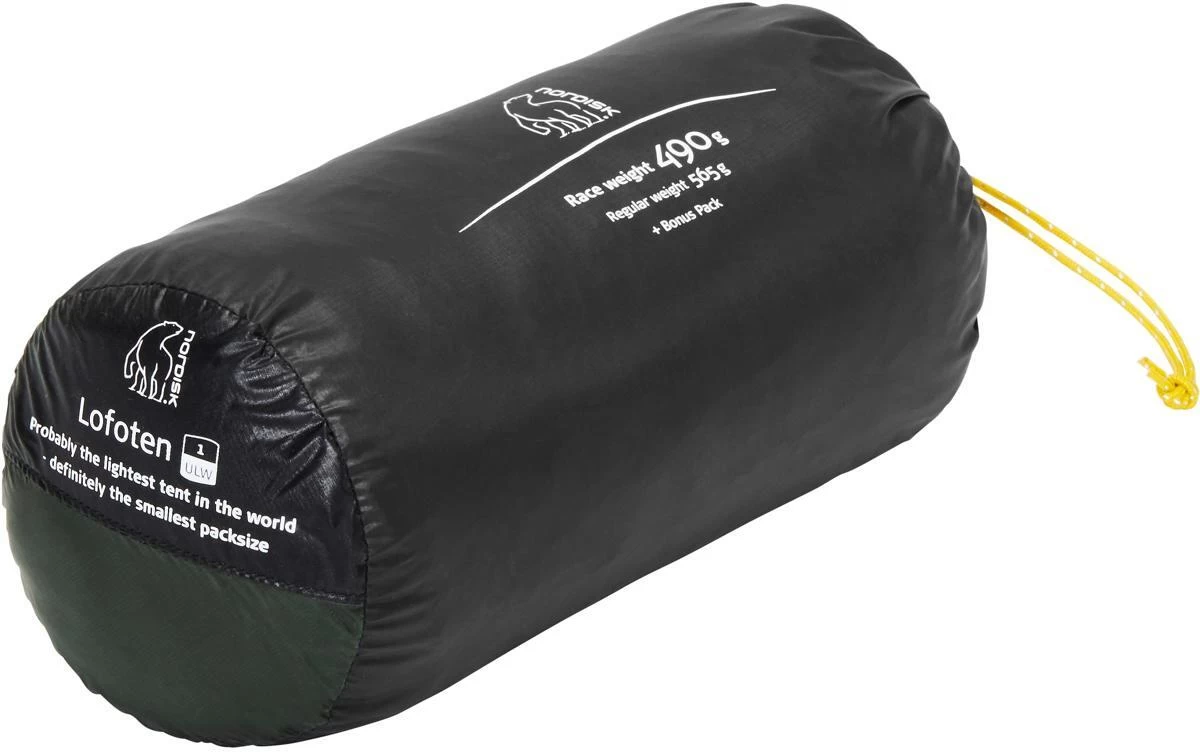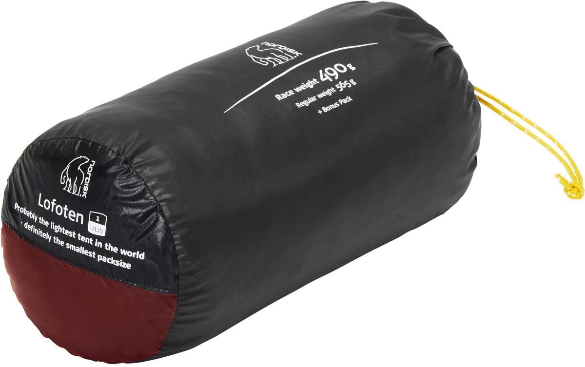 Lofoten 1 ULW ist mit einem Minimalgewicht von 490 g eines der leichtesten Zweilagenzelte weltweit – gepackt jedoch ist es definitiv das Kleinste. Sein Geheimnis ist das, nach neuestem Stand der Technik konstruierte, Aluminiumgestänge mit ultrakurzen Segmenten, die im unkomprimierten Zustand ein Packmaß von nur 11 x 22 cm ermöglichen. Bei dem Gewebe handelt es sich um das neuartige Nortech T-NY 7D mit einem Gewicht von lediglich 26 g/m2 bei einer Fadenanzahl von 580. Die 3-lagige Silikonbeschichtung auf jeder Seite gewährleistet eine hohe Widerstandsfähigkeit sowie wasserabweisende Eigenschaften und das neue Nordisk Flex-Rope Suspension System sorgt zudem noch für hohe Flexibilität und Stärke. Lofoten kann sich von einem 1-Personen- in ein 2-Perseonen-Zelt verwandeln, indem man einfach das Innenzelt austauscht.
