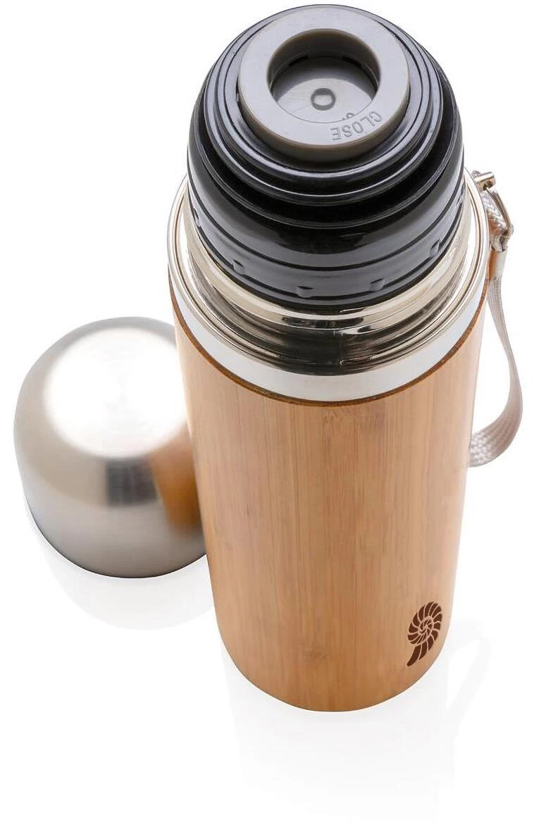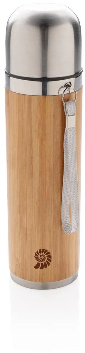 Edle doppelwandige Isolierflasche mit schönem Bambus- und Edelstahldekor. Mit komfortablen Druckknopfverschluss zum praktischen Ausgießen per Knopfdruck. Ausgestattet mit Trageschleife und Deckel der auch als Trinkbecher für unterwegs benutzt werden kann. Hält heiße Getränke lange warm und kalte Getränke auch an warmen Tagen länger kühl. Ein echter Blickfang für unterwegs, im Büro, beim Campen oder als Geschenkidee.