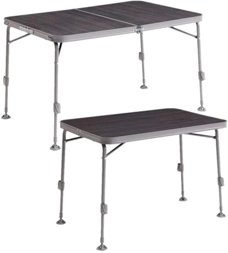 Der Cortina Tisch verfügt über teleskopierbare übergroße Aluminiumbeine für eine einfache, sichere Höhenverstellung und flache Füße für tragende Unterstützung. Der Hauptvorteil ist jedoch, dass die äußerst haltbare Harztischplatte resistent gegen die Auswirkungen der UV-Strahlen der Sonne ist, hitzebeständig und auch wetterfest, was die Sorge beseitigt, dass sie für kurze Zeit im Regen liegen gelassen wird. Die großen, schwenkbaren Kunststofffüße bleiben auf unebenem Untergrund stabil und sinken nicht in weichen Boden und beschädigen Ihre Bodenplane. Der große Tisch lässt sich in zwei Hälften zusammenfalten und hat einen Tragegriff an der kürzesten Kante für den Transport. Es ist ideal für Familien- und Gruppencampingurlaub.