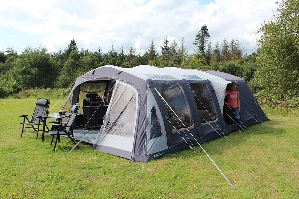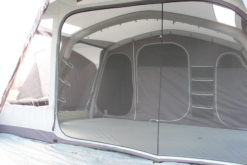 Die weitläufigen getönten Scheiben ermöglichen einen Panoramablick auf die Außenwelt und schützen vor schädlichen Strahlen, während die Privatsphäre erhöht und der Innenraum an einem Morgen beleuchtet wird. Diese werden von Reißverschlussvorhängen begleitet, die vollständig zurückgerollt oder an einem Abend vollständig eingekippt werden können, um absolute Privatsphäre zu gewährleisten. Eine PE-Bodenplatte wurde eingenäht, um den Komfort beim Aufstellen zu erhöhen, das Eindringen von Wasser zu verringern und zu verhindern, dass Insekten in den Wohnbereich gelangen. Dieses Familienzelt verfügt über eine interne Trennwandtür mit zwei Dritteln und Reißverschluss hinten, die von großen Fenstern und Jalousien begleitet wird und eine einladende Veranda für Entspannung im Freien schafft.