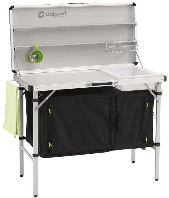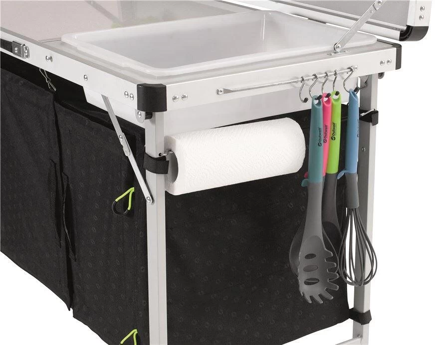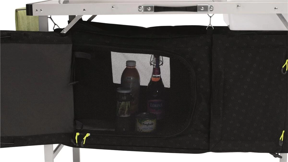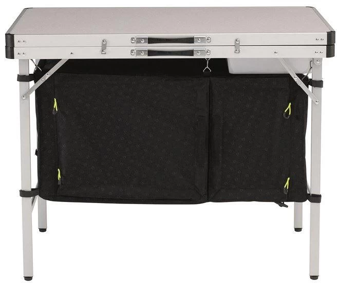 Die Tischplatte, die Ablage und das Gewebe dieses Küchentisches sind mit dem schicken Logo-Muster verziert. Dieser Küchentisch leistet nicht nur als stabile Arbeitsfläche beim Kochen wertvolle Dienste, sondern begeistert auch mit seinem geschlossenen Stauraum zur Unterbringung von Töpfen, Lebensmitteln und Gasflaschen. Mit seiner leichten Handhabung und seinem geringen Packmaß trägt er entscheidend zu einem fantastischen Kocherlebnis bei.