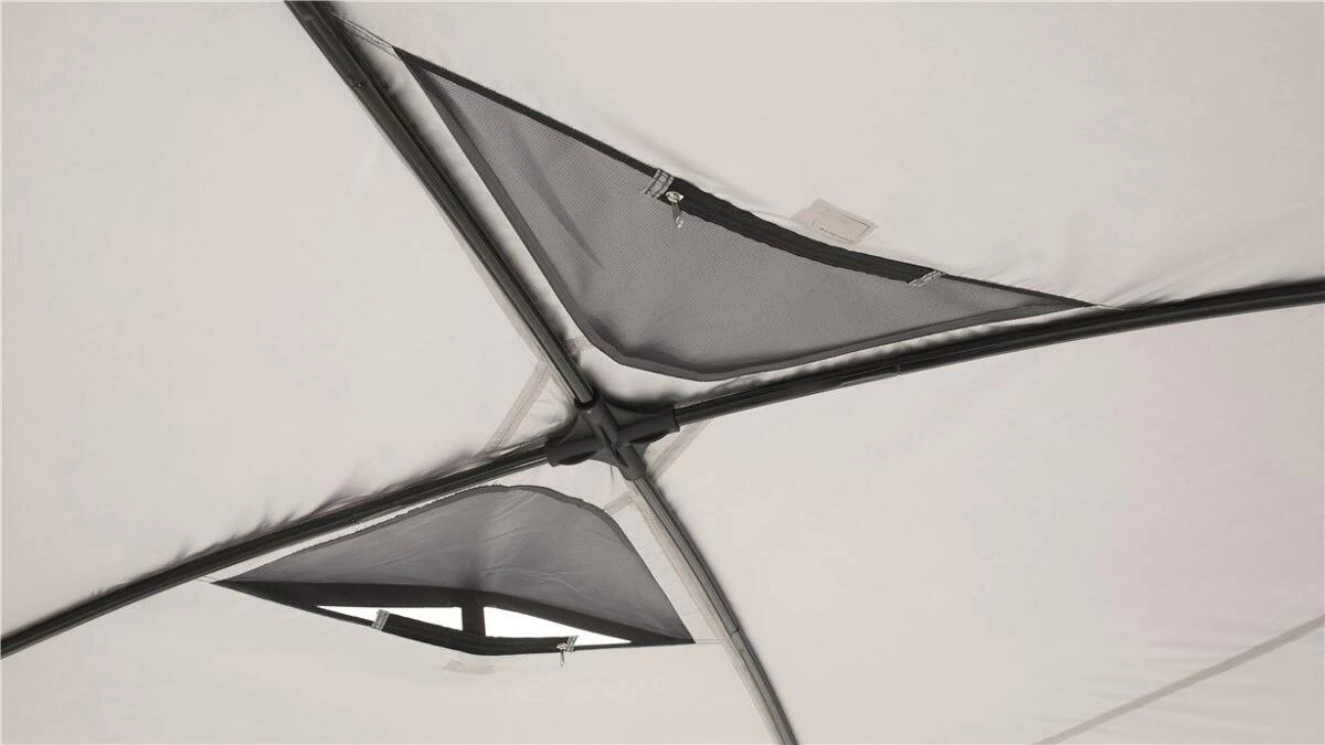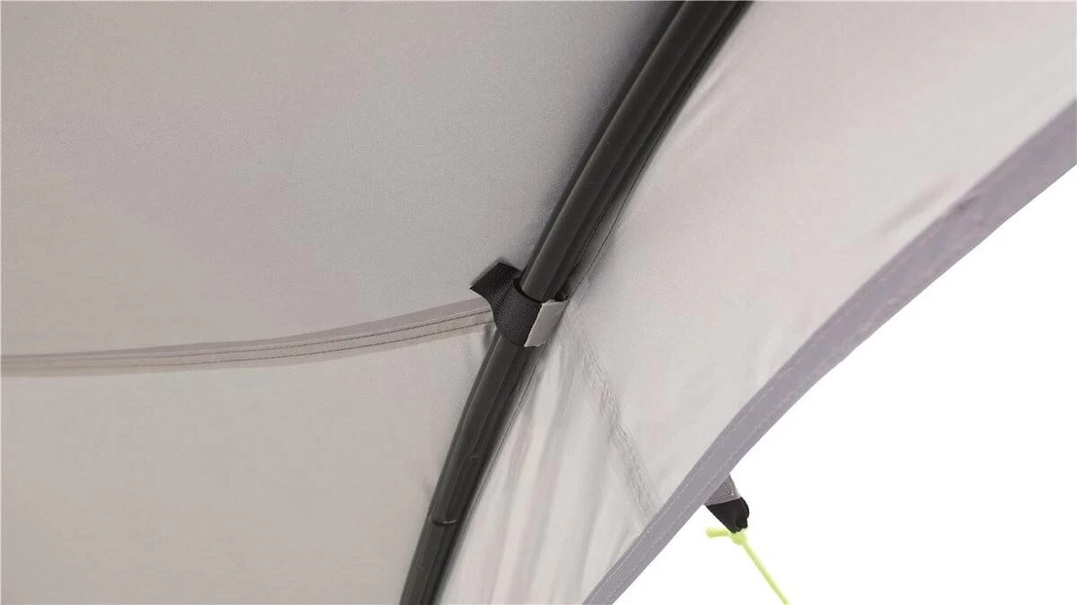 Die Outwell Event Lounge bietet einen vielseitig nutzbaren, frei stehenden Unterschlupf. Die äußerst robuste und stabile Konstruktion zeichnet sich durch große Zugänge und eine bequeme Stehhöhe aus. Dank der Belüftungsöffnung an der Spitze, dem Aufhängepunkt für eine Laterne in der Mitte sowie zwei Netztaschen bietet die Lounge ein Höchstmaß an praktischer Flexibilität. Das Polyester ist mit einer Silber- und PU-Beschichtung versehen, sodass es einer Wassersäule von 1500 mm standhält. Um einen größeren geschützten Aufenthaltsbereich zu schaffen, können miteinander kompatible Schutzdächer über eine Regenrinne verbunden werden.