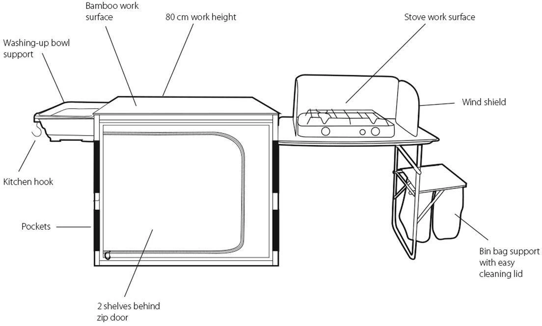 Die ultimative mobile Küche! An diesem Padres-Küchentisch mit Tischplatte und Beistellregal können Sie überall Essen zubereiten, kochen und abwaschen. Auch Küchenutensilien können Sie ganz einfach darin verstauen. Der Tisch lässt sich in Sekundenschnelle aufklappen, sodass Sie die große Bambusarbeitsfläche, den Seitentisch, den Windschutz, den ausziehbaren Abwaschschüsselhalter und den Mülleimer mit Deckel nutzen können. In den praktischen Seitentaschen können Sie Küchenutensilien und Gewürze optimal aufbewahren. Nach dem Gebrauch können Sie den Tisch einfach zusammenklappen und in der Tragetasche verstauen.