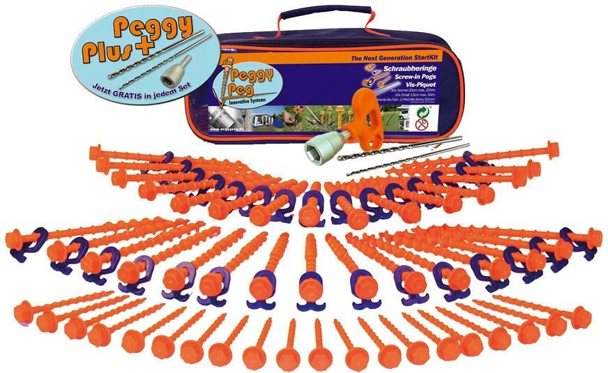 Der glasfaserverstärkte, höhenverstellbare Universal-Schraubhering für Vorzelte, Leinen und Zelte etc. Inhalt: 30 Peggys N 20 cm lang mit 30 Haken, 20 Peggys S 12 cm plus Kombi Tool mitDrill Setund Aufbewahrungstasche (100 % Polyester). Ausreichend für Vorzelt Caravan 4,5 – 5,0 m Aufbaulänge.